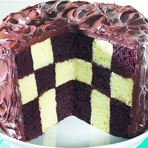 - Paso cuatro: Para el montaje, coloque los pasteles en capas uno encima del otro, alternando las secuencias de colores (Nota: las dos capas que tienen la misma secuencia de colores serán la capa inferior y superior del pastel). Escarcha y decora como desees. Córtalo en forma de pastel para ver el diseño del tablero de ajedrez.