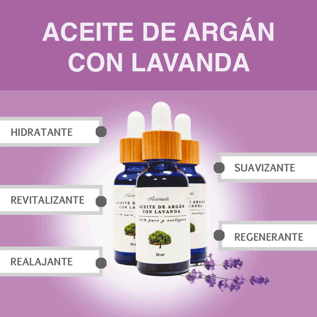 El aceite de argán combinado con aceite esencial de lavanda ofrece una hidratación profunda, mejorando la elasticidad de la piel y fortaleciendo el cabello. El argán nutre y regenera, mientras que la lavanda calma, reduce la inflamación y mejora el bienestar general. Juntos, son perfectos para hidratar la piel, aliviar el estrés, calmar irritaciones y promover un cabello brillante y saludable. Ideal para quienes buscan un cuidado natural y relajante.