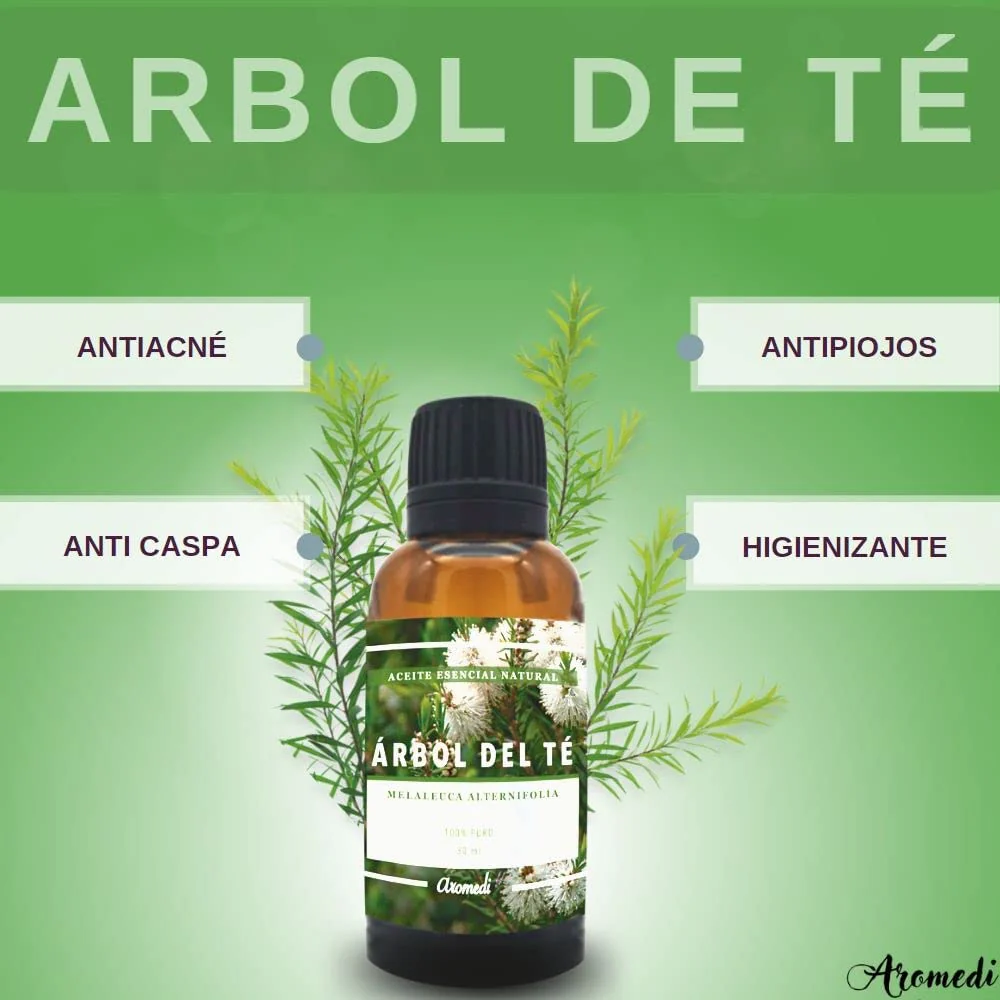 El aceite esencial de árbol de té 100% es un poderoso antibacteriano y antifúngico. Ideal para tratar el acné, infecciones cutáneas, caspa y piojos. Un remedio natural imprescindible.