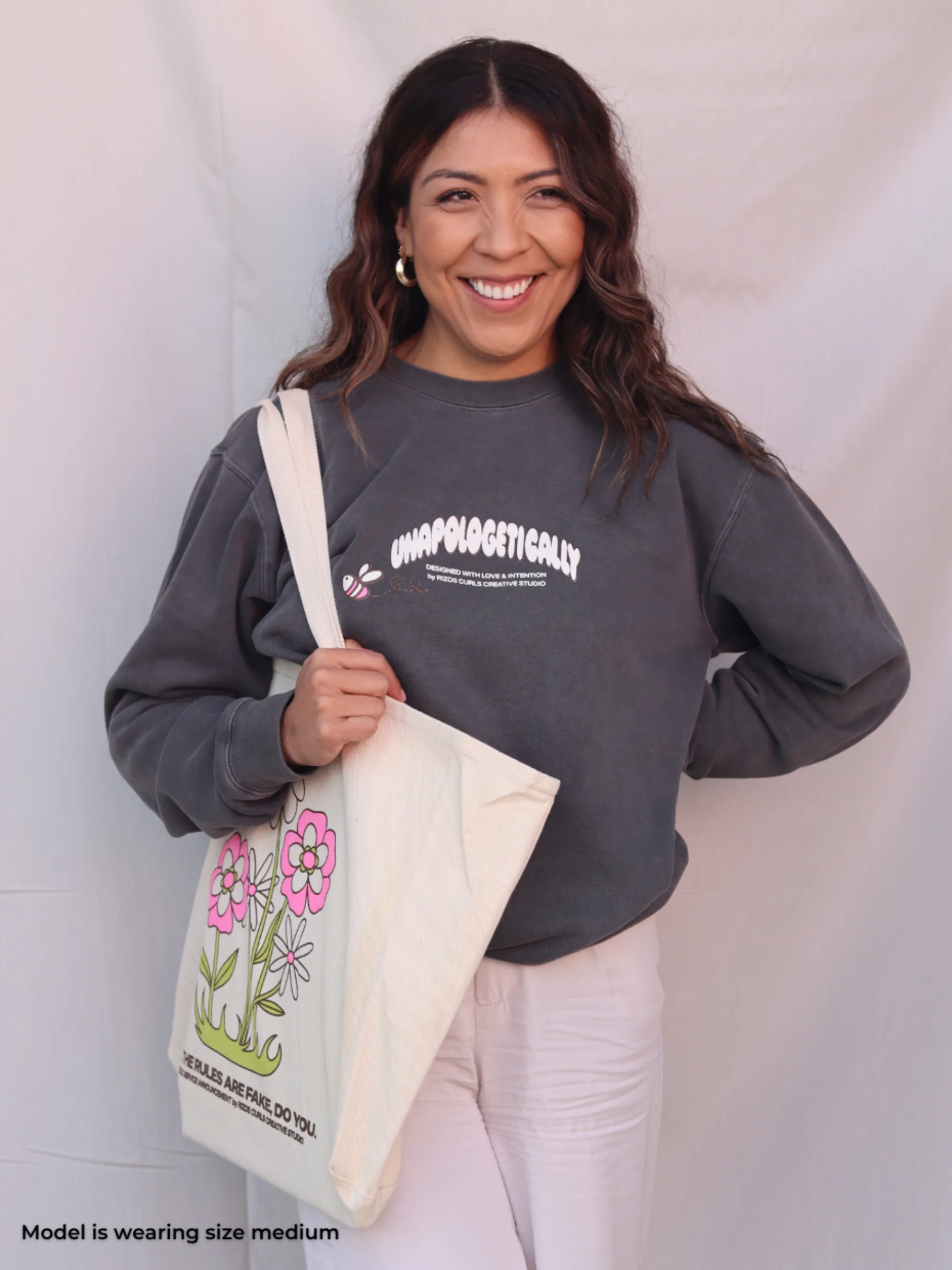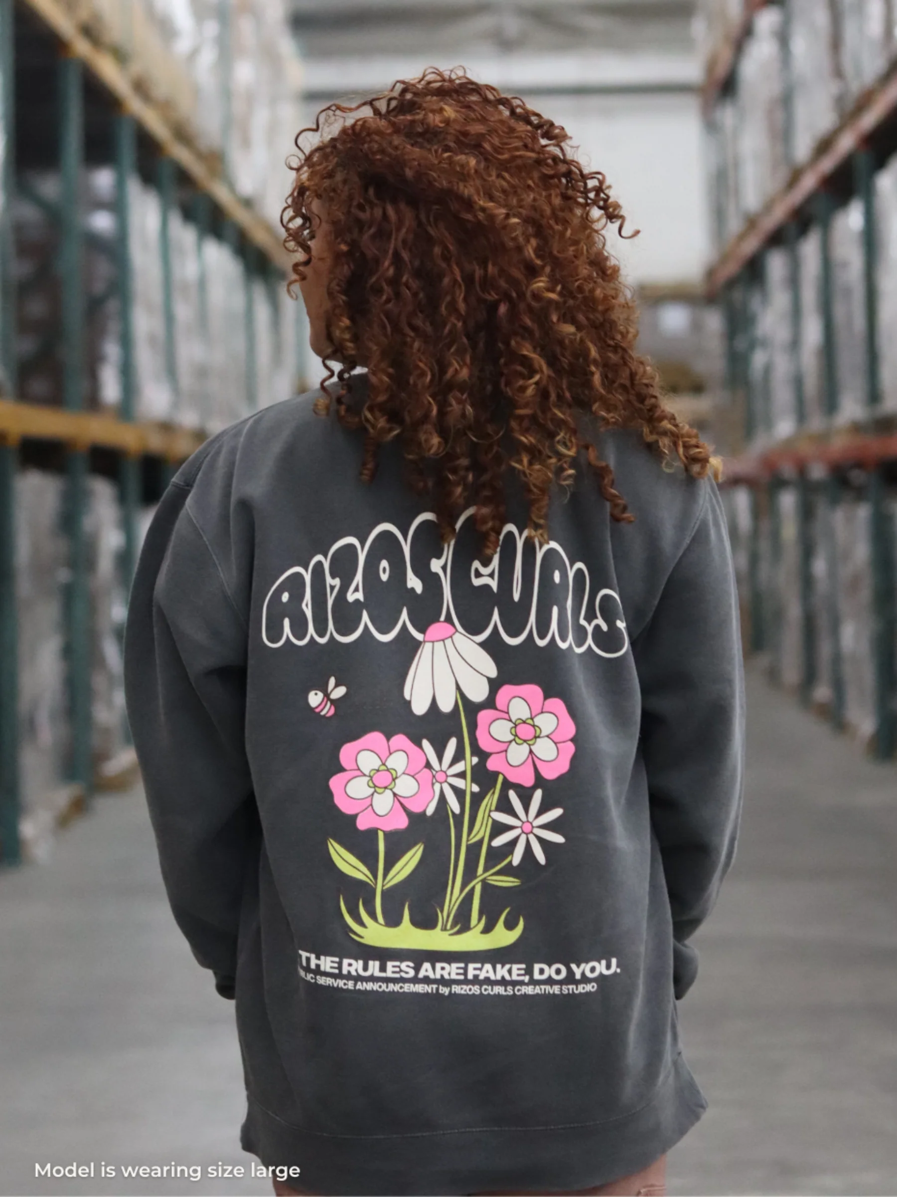 Nuestra sudadera con cuello redondo Rizos Curls unisex ‘Unapologetically You’ está hecha de 100% algodón y se ajusta a la talla real. Cita en la parte posterior: “Todas las reglas son falsas, ¿verdad? Un anuncio de servicio público de Rizos Curls Creative Studio”