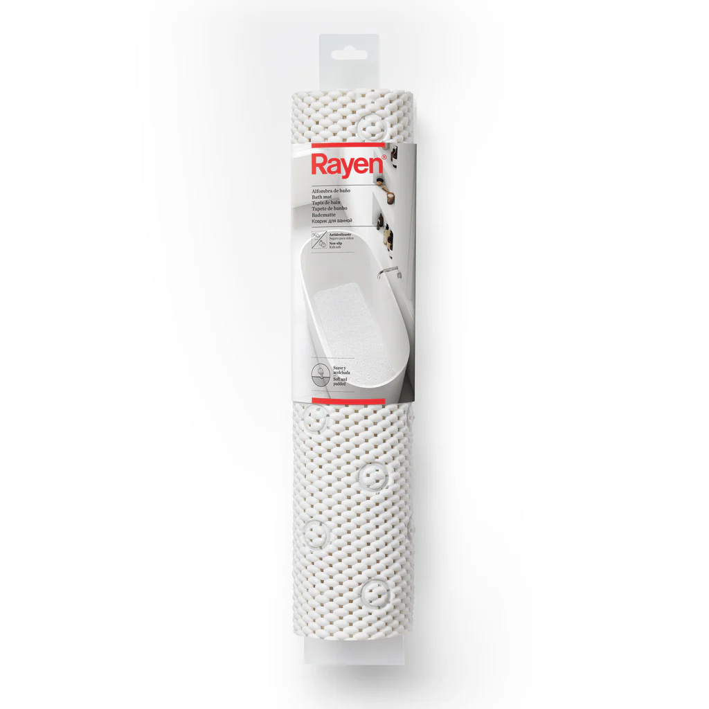 La alfombrilla de baño de PVC Rayen ofrece varias ventosas que se adhieren de forma eficaz a la superficie de la bañera para una mayor estabilidad y evitar resbalones. Esta alfombrilla cuenta con una superficie lisa que le da un aspecto agradable. La alfombrilla se puede secar al aire después de haberla limpiado o lavado. Es una práctica alfombrilla de baño lavable con huecos para una mejor ventilación y drenaje del agua. Su calidad antideslizante también es ideal para el tiempo de juego de los niños.