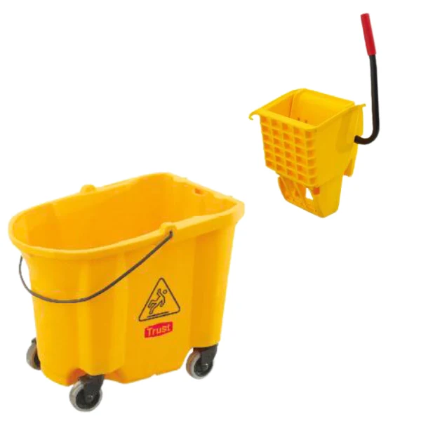 Balde escurridor de 33L Trust amarillo con sistema anti-oleaje para evitar que se riegue el agua al moverlo, escurridor de alta eficiencia con menor esfuerzo, mayor durabilidad por su fabricación con acero tubular de primera calidad y plástico moldeado en red estructural. Ruedas totalmente de plástico no dejan marcas reducen la limpieza posterior al trabajo.