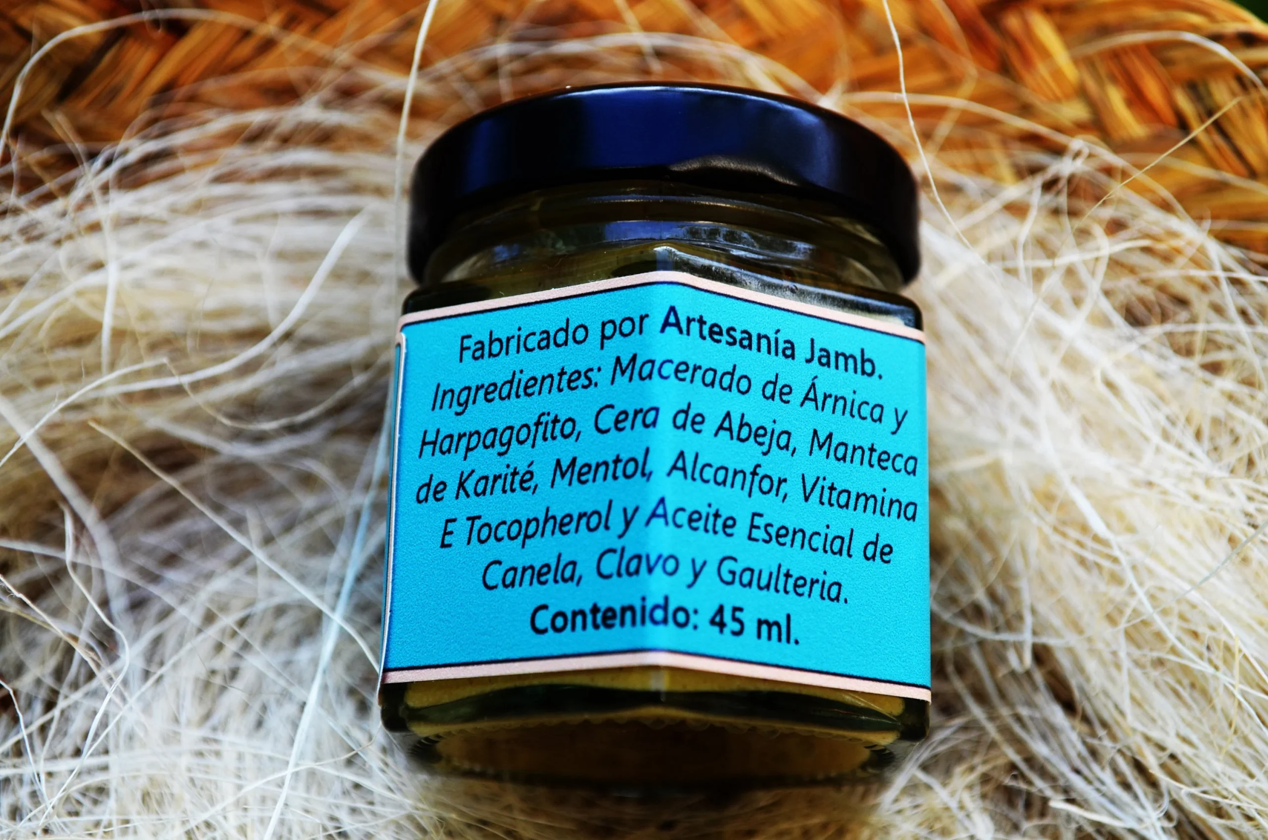 Macerado de Árnica y Harpagofito, Cera de Abeja, Manteca de Karité, Mentol, Alcanfor, Vitamina E Tocopherol y Aceite Esencial de Canela, Clavo y Gaulteria.