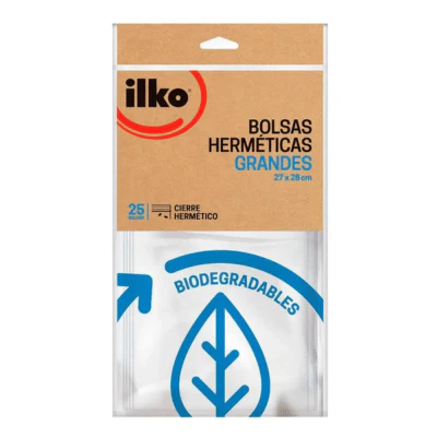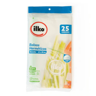 Bolsas de cierre hermético de 27 x 28 centímetros. Funcionan bien para guardar comida en la nevera y organizar objetos en las gavetas. Por tener cierre hermético, puedes guardar líquidos también.