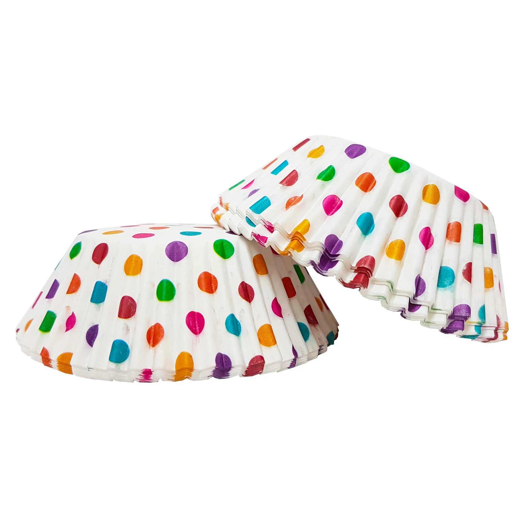 Los capacillos blancos con puntos multicolor están hechos de papel pergamino y son adecuados para hornear. Puede forrar un molde para muffins con ellos o usarlos para servir postres sin hornear. Los capacillos tienen un diámetro de 5 cm.