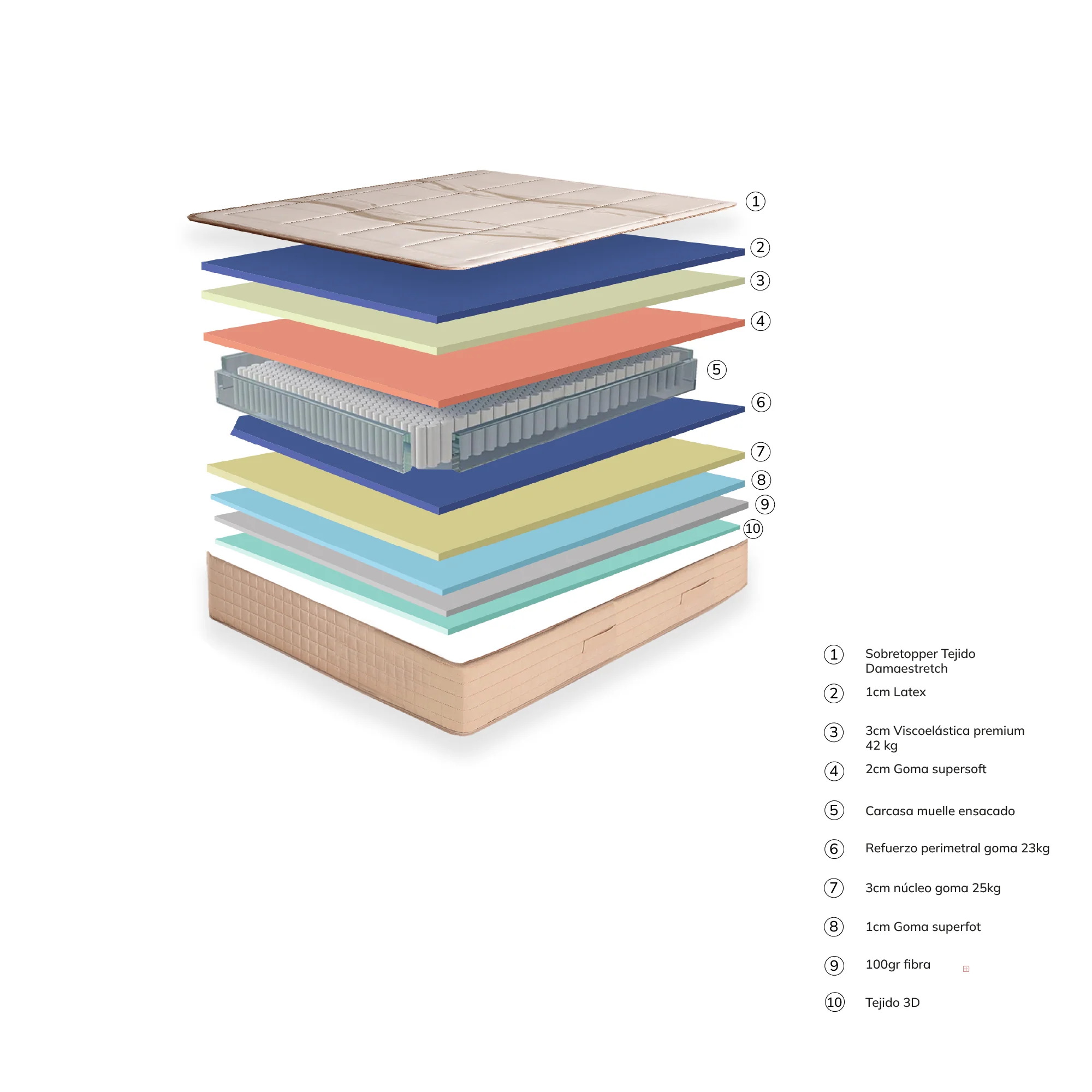 - 3 cm de viscoelástica de alta densidad (42 kg/m³).