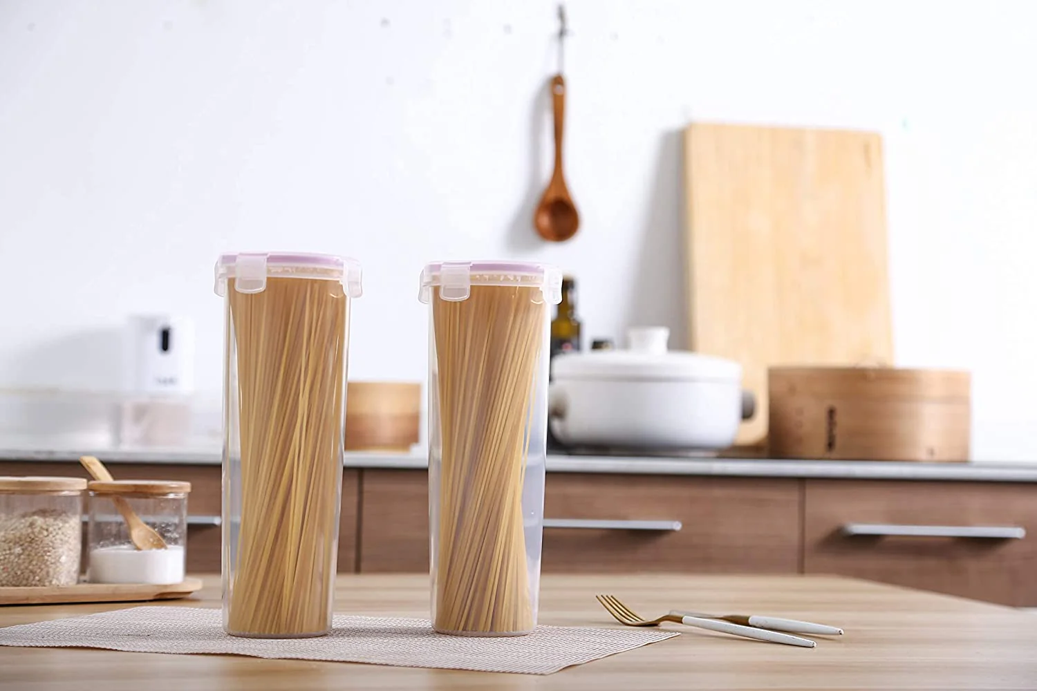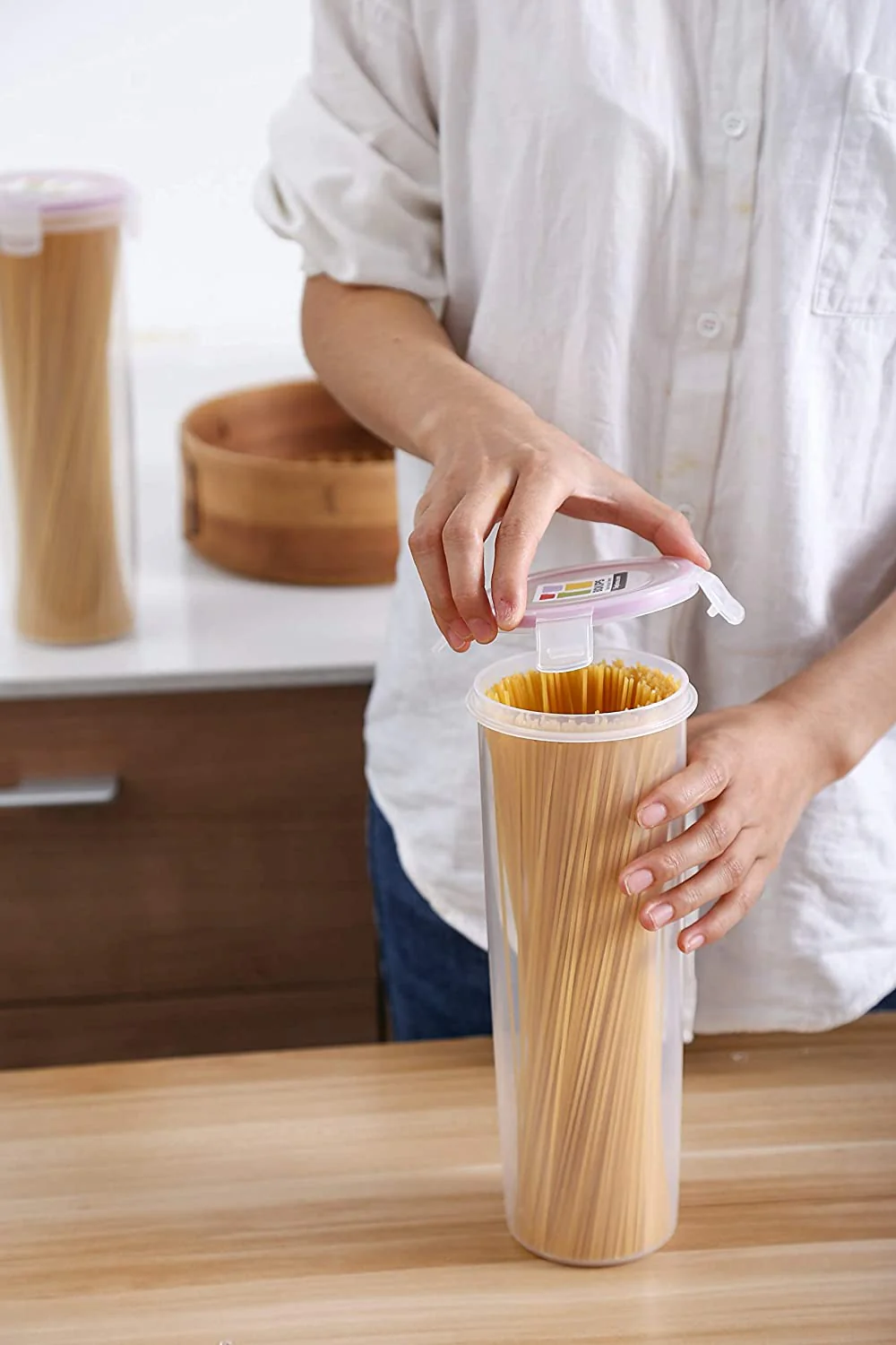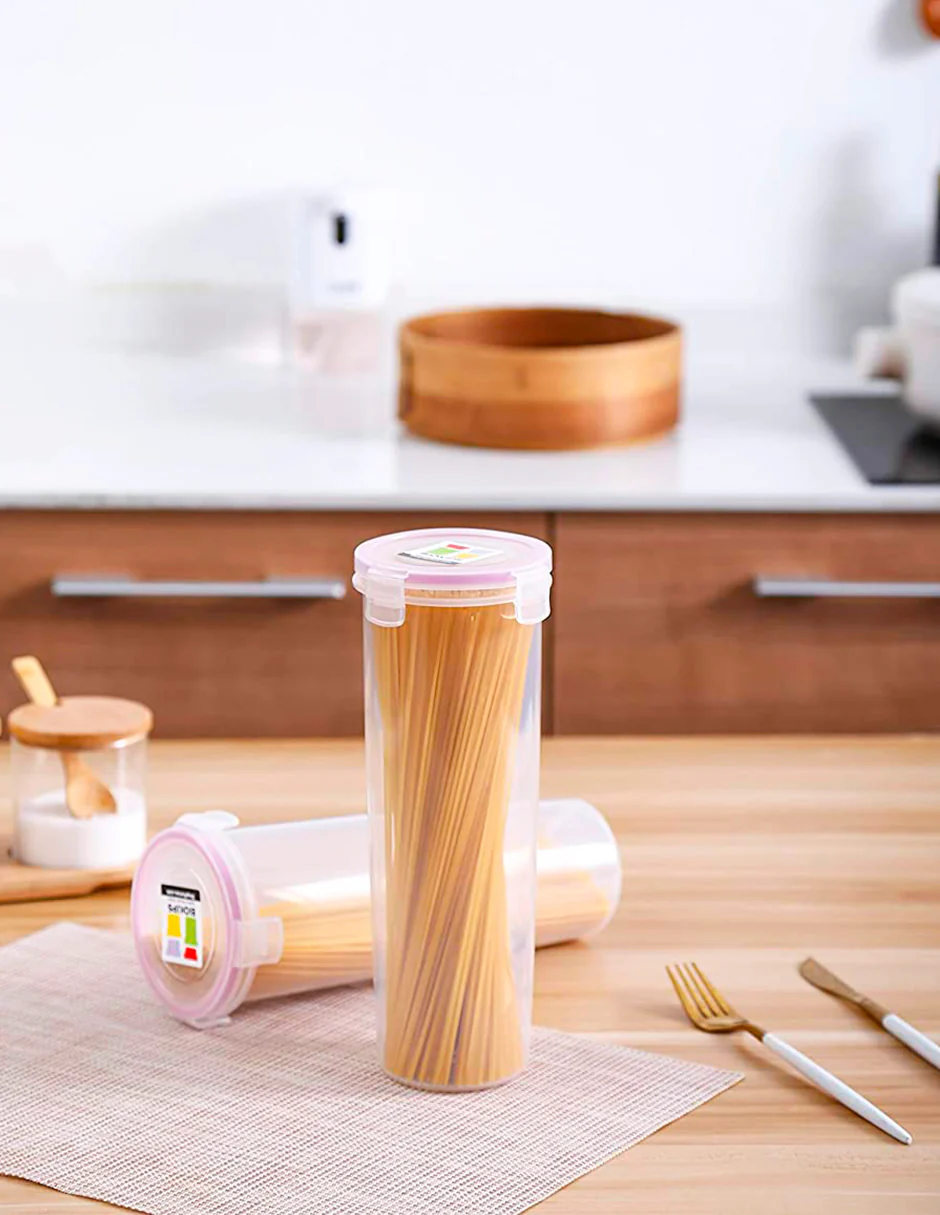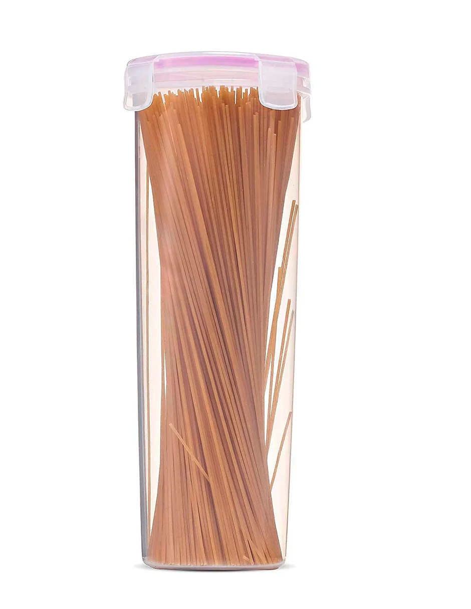 Almacenamiento fresco y libre de humedad: el juego de contenedores de almacenamiento de despensa de espaguetis y fideos cuenta con tapas de bloqueo de 4 vías en un cuerpo cilíndrico. Nuestros contenedores de almacenamiento de pasta para despensa y encimera de cocina lo ayudan a controlar sus porciones de pasta y ahorrar un poco más.