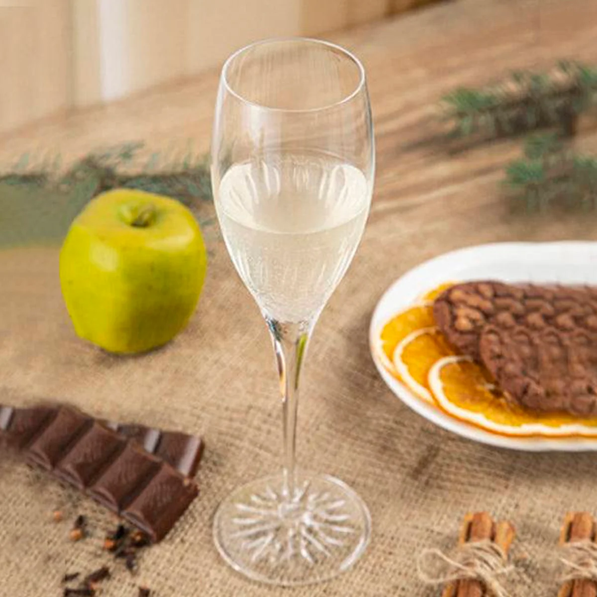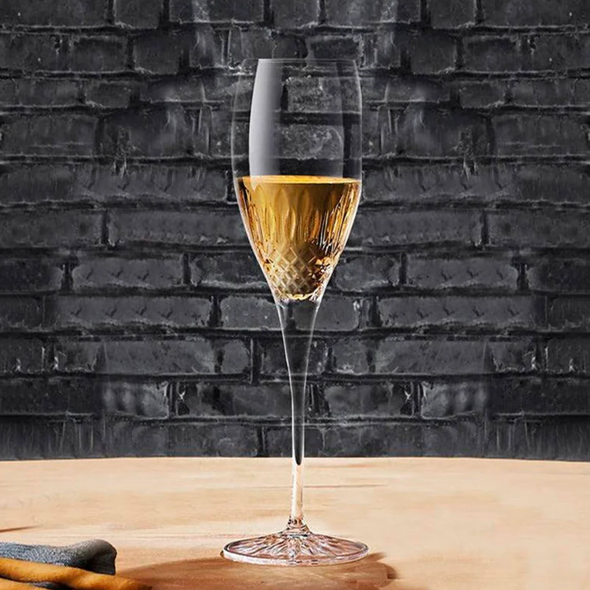 Con una capacidad de 220 ml, está fabricada en vidrio cristalino de alta pureza, lo que ofrece una transparencia excepcional y gran resistencia al uso diario. Su forma estilizada ayuda a conservar las burbujas por más tiempo, realzando los aromas y elevando la experiencia de cada brindis.