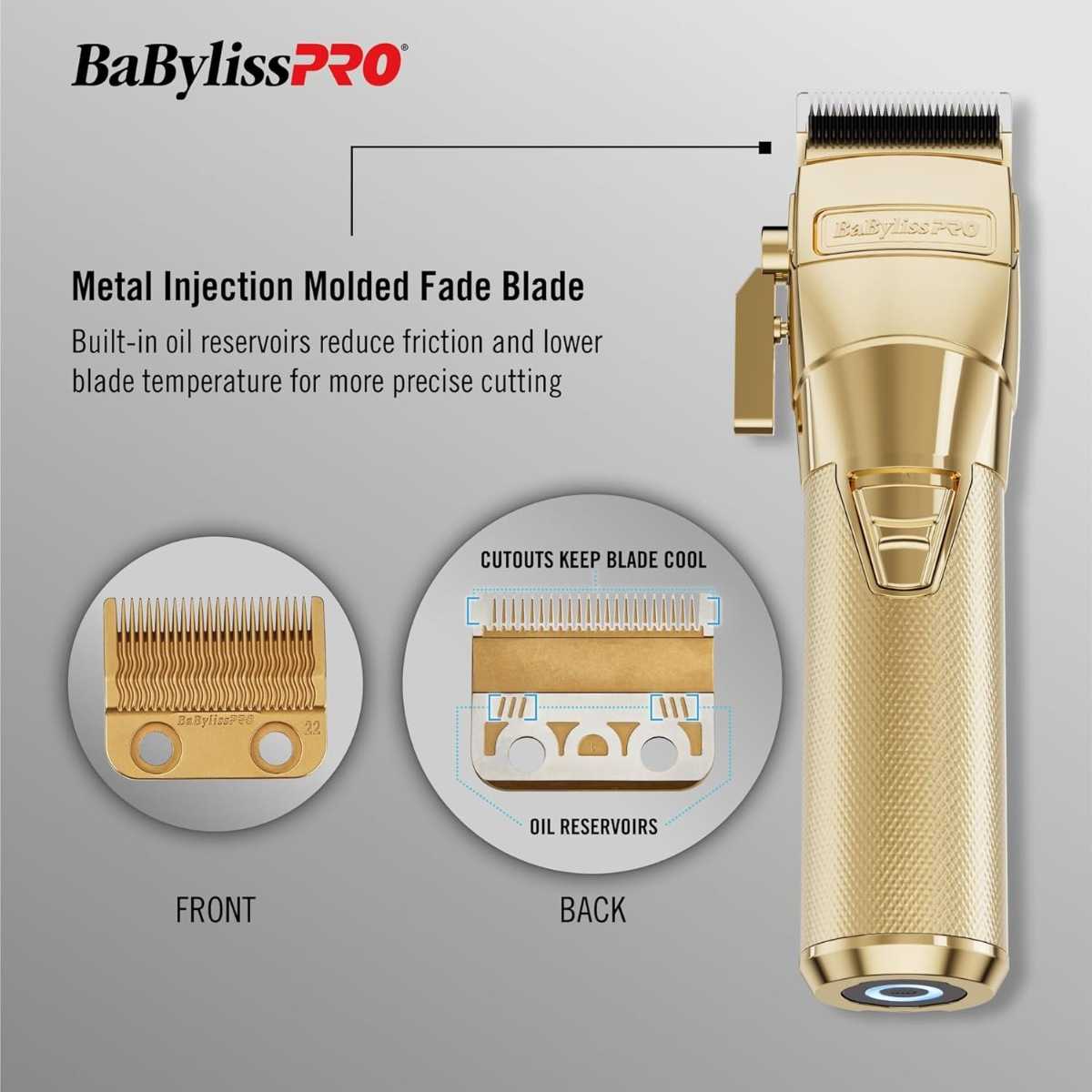 - Cuchilla Fade de Inyección Metálica (MIM) de Titanio Dorado (FX8022G): Proporciona un corte suave y preciso con menor temperatura de la hoja y ranuras para el depósito de aceite que aseguran una lubricación constante.