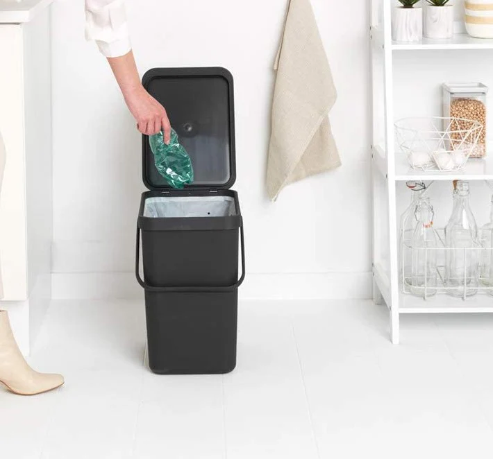 Una vez vacíos, tira los envases, las botellas, las latas o cualquier otra cosa que quieras separar en el cubo para reciclaje Sort & Go de 12 litros de Brabantia. Colócalo en una esquina, contra la pared o incluso puedes colgarlo para tener el suelo despejado. Y cuando llegue el momento de vaciarlo, está chupado, ya que tiene una gran asa para transportarlo y otra para cogerlo por debajo. ¡Esto sí que es organización!