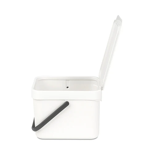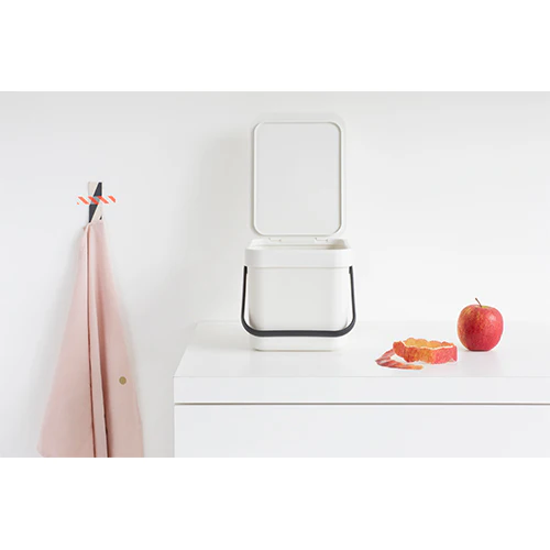 El bonito cubo de basura de 6 litros con tapa abierta es perfecto para la eliminación de residuos orgánicos directamente en la encimera de la cocina.