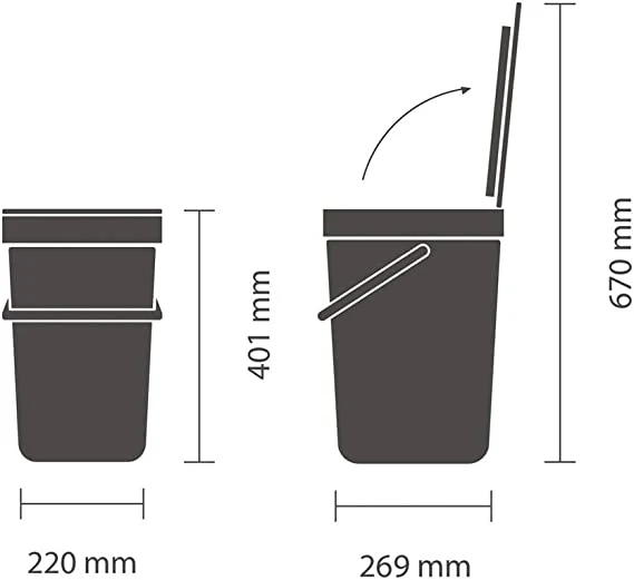 Estos cubos de 16 litros se pueden utilizar para separar la recogida de todos los residuos domésticos como botellas, latas o envases de plástico. El asa grande y el cómodo agarre inferior facilitan el vaciado de desechos del balde. La solución ideal para la recogida selectiva de residuos domésticos. Se puede utilizar en el suelo o fijado a la pared – soporte de pared incluido. Ajuste perfecto Bolsas con cordón Brabantia PerfectFit disponibles (talla D): fáciles de colocar en el cubo.