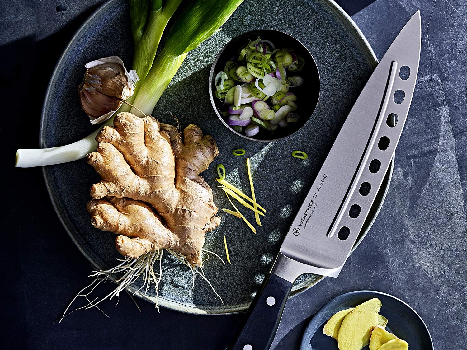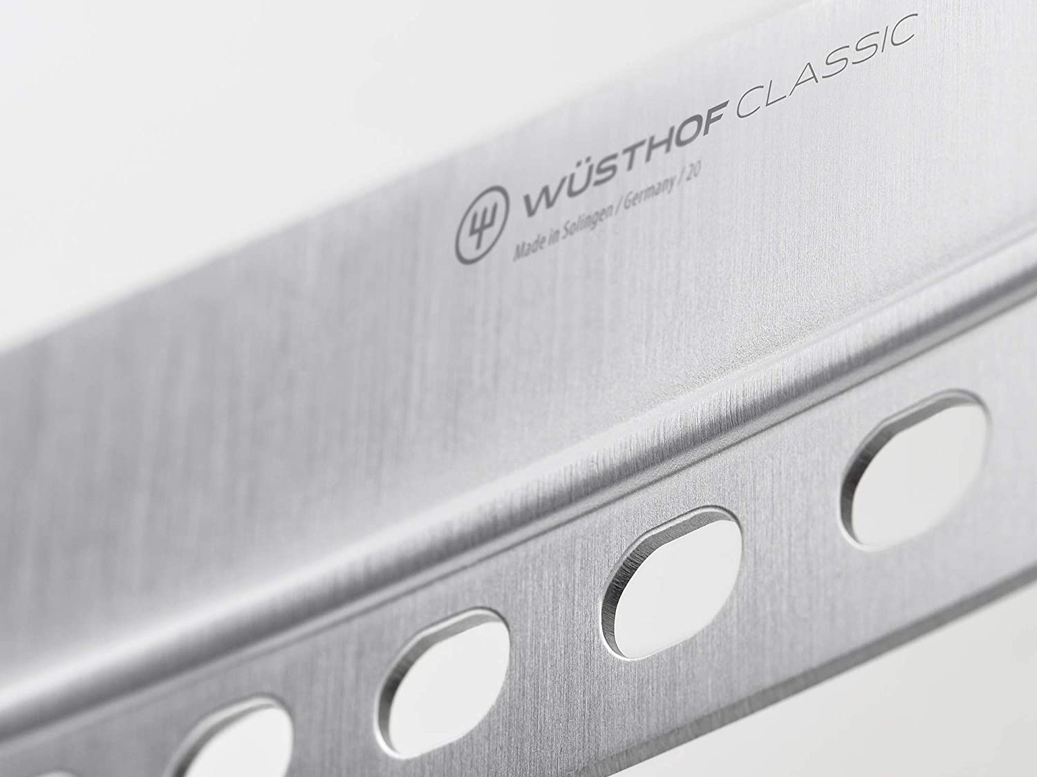 Este cuchillo de chef de la colección Wüsthof Classic se diferencia de otros cuchillos de chef por los agujeros en la hoja. Estos agujeros aseguran que la comida no se pegue a la cuchilla. Sobre estos agujeros encontrarás una repisa: el ‘limpiador’. Esta parte del cuchillo asegura que los alimentos cortados se deslicen de la hoja.