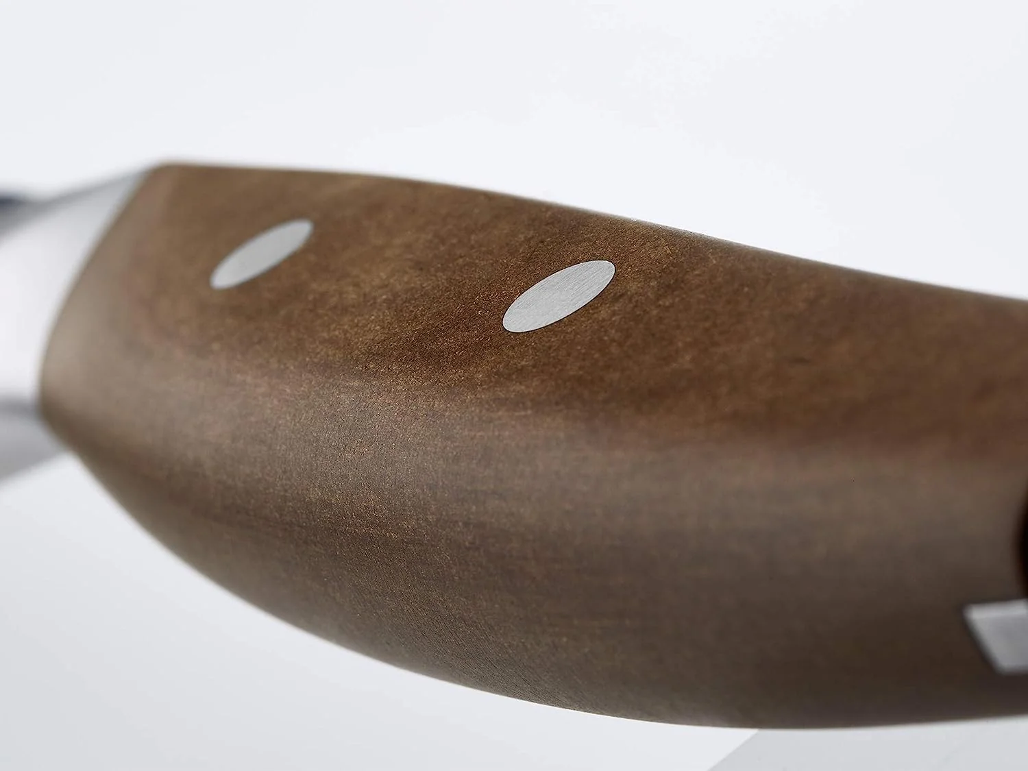 El mango está hecho de capas de papel y resina sintética. Como tal, terminas con la sensación de la madera, pero con las cualidades higiénicas del plástico. Al igual que la hoja, el mango también es un poco más grande. El mango de diseño ergonómico garantiza una comodidad óptima. La parte delantera es relativamente ancha pero se adelgaza hacia atrás para adaptarse a la posición natural de la mano. El mango está sujeto con dos remaches de acero inoxidable.