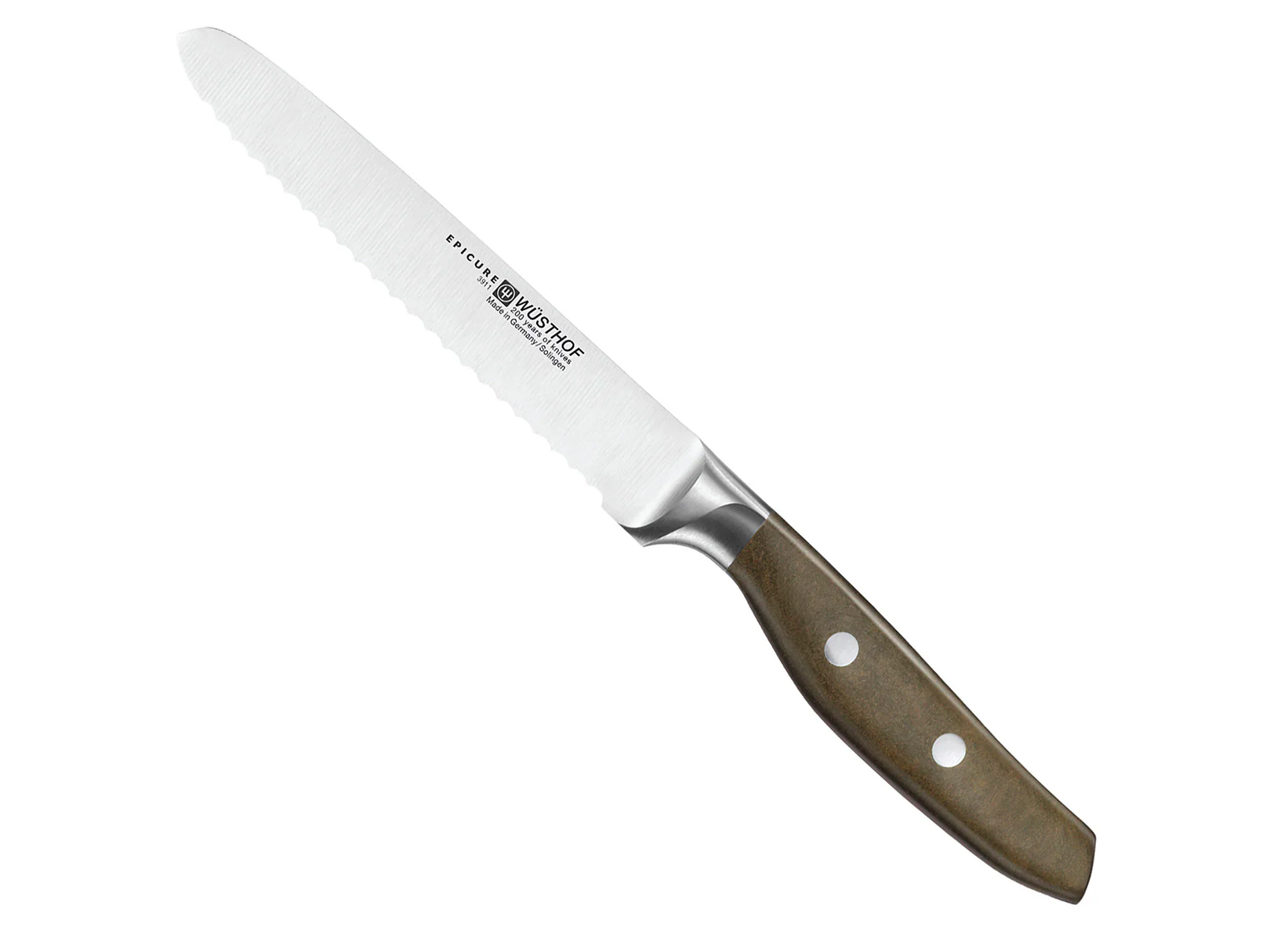 El nombre de la navaja multiusos dentada Wüsthof Epicure . ya podría sugerirlo: este es un verdadero todoterreno. El cuchillo está mejorado con una hoja dentada. Especialmente cuando esté cortando productos con una corteza más dura, notará la diferencia. Por lo tanto, este cuchillo es perfecto para cortar hogazas de pan duro. Sin embargo, los tomates, el queso y las salchichas tampoco son rival para este cuchillo.