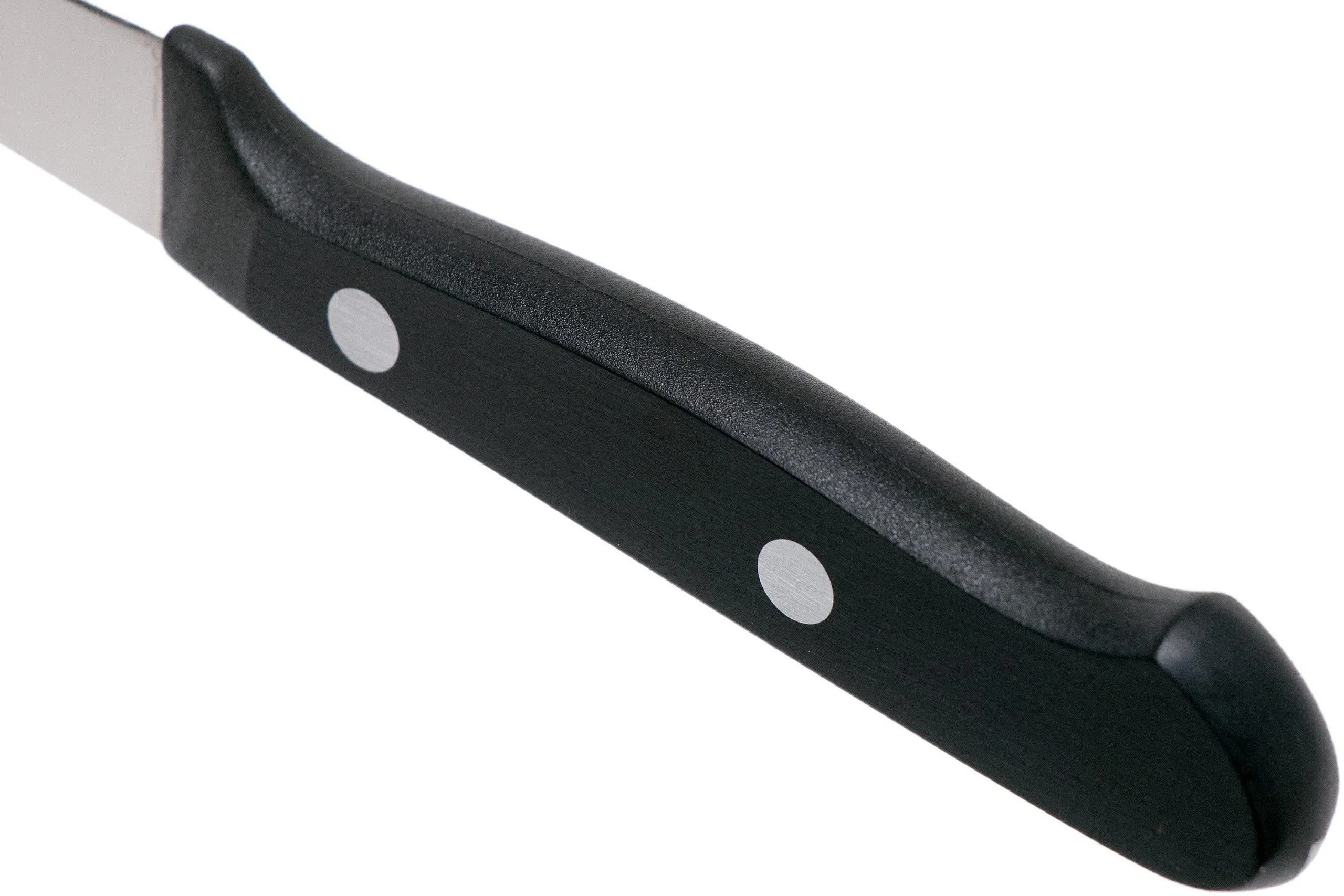 Este cuchillo pelador Wüsthof Gourmet es un cuchillo pequeño pero versátil con una hoja fina y un filo liso. Este cuchillo para verduras está hecho para cortar cebollas y hierbas, pero también es ideal para picar, limpiar y decorar frutas y verduras. Con la punta puntiaguda puedes pinchar algo fácilmente, esto es una ventaja y una desventaja.