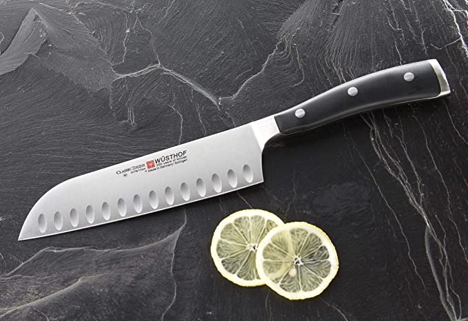 El cuchillo Santoku de borde hueco de 5 pulgadas está diseñado con una hoja más delgada que el cuchillo de chef tradicional, con un borde de corte de 10, y se curva gradualmente hacia arriba en el extremo proporcionando un borde más recto. El borde hueco contiene muescas verticales uniformemente espaciadas que crean pequeñas bolsas de aire entre la hoja y la comida. Estas pequeñas bolsas de aire empujan suavemente los alimentos fuera de la cuchilla y reducen la fricción y el arrastre al rebanar.