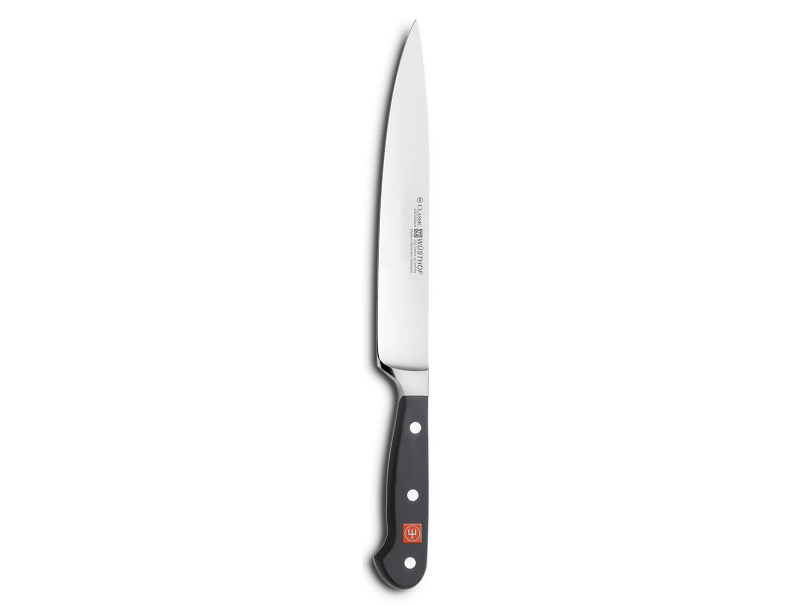 Cortes delgados, limpios y precisos. El cuchillo para jamón Wüsthof Classic de 20 cm está diseñado especialmente para filetear carnes frías, jamones curados, embutidos y pescados con la delicadeza que requieren.