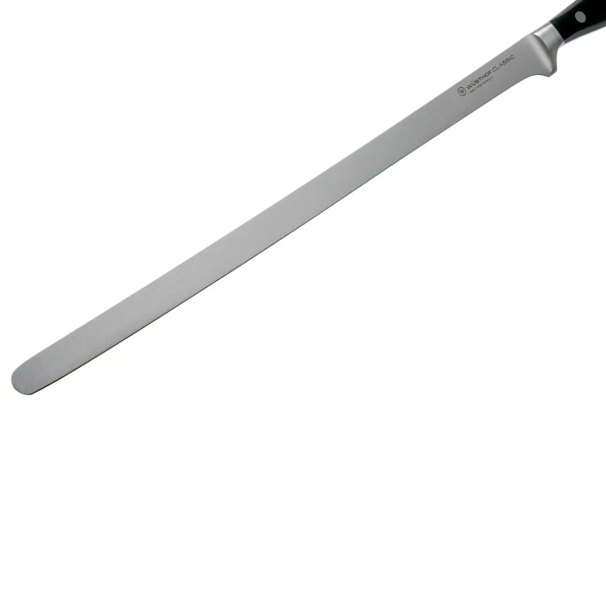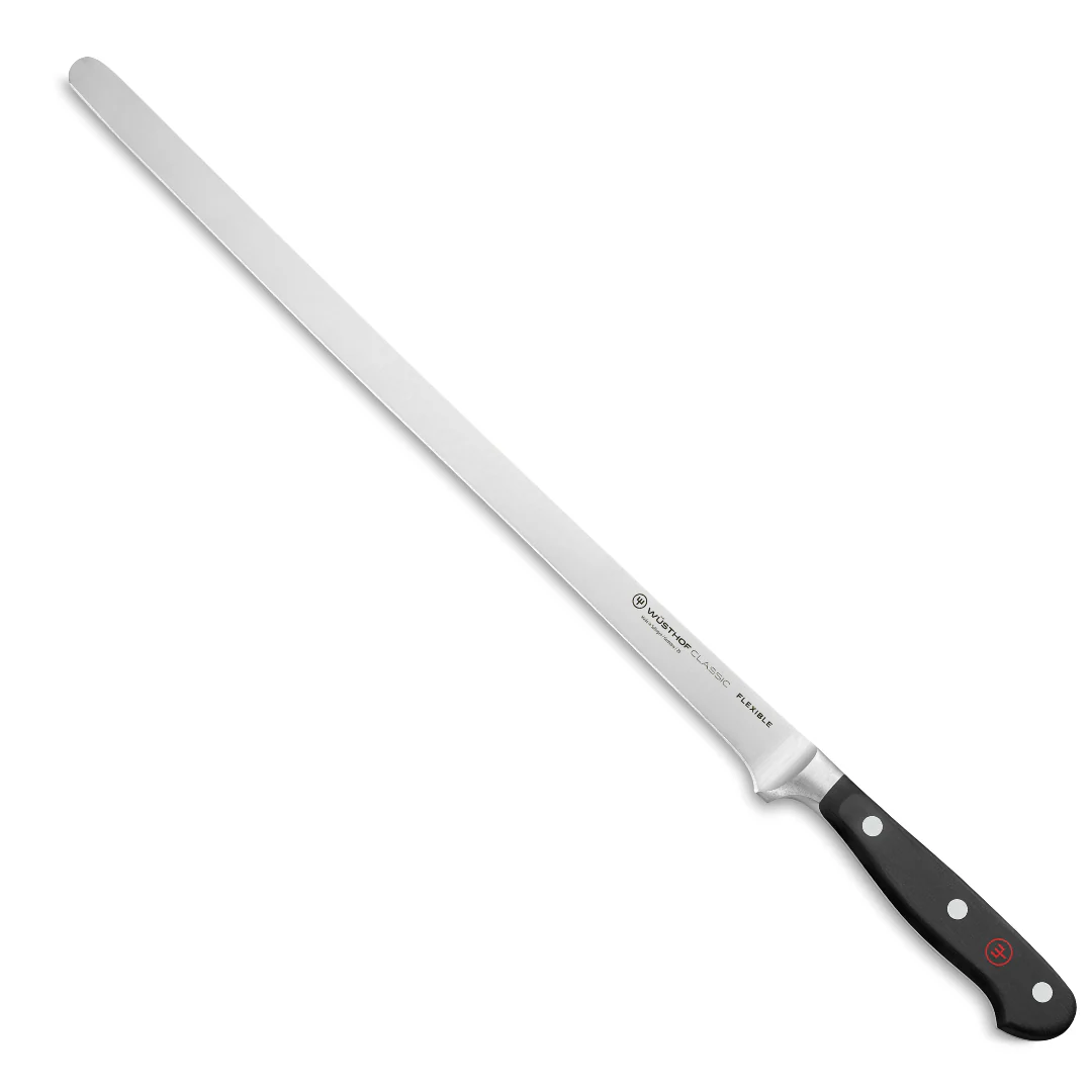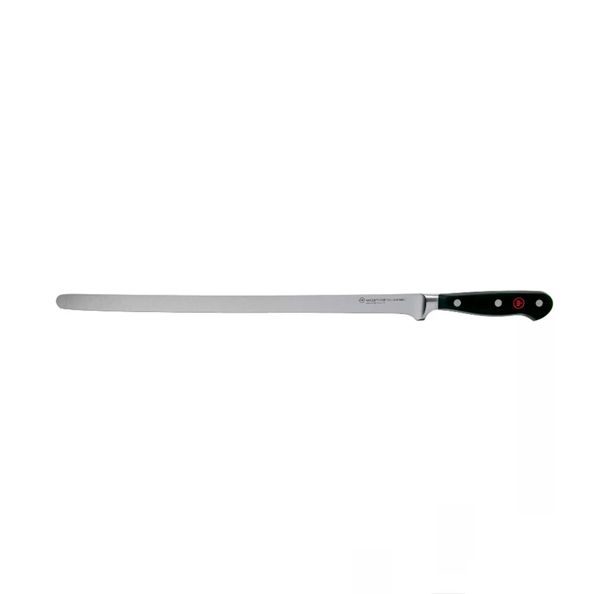 Este cuchillo de salmón Wüsthof Classic es perfecto para preparar y cortar el salmón. Este cuchillo para salmón está mejorado con una hoja flexible y afilada para asegurarte de que puedes cortar fácilmente un trozo de salmón. Perfecto para cortar rebanadas muy finas.