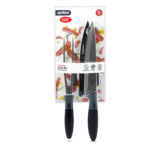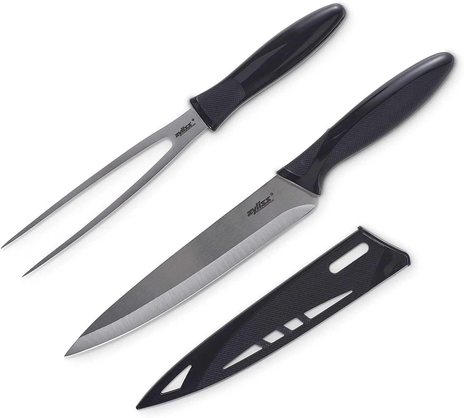 El juego de cuchillos para trinchar de 2 piezas Zyliss incluye un cuchillo para trinchar de 8 pulgadas y un tenedor para trinchar. El cuchillo para trinchar tiene una hoja de acero inoxidable de alta calidad y es perfecto para rebanar carnes, pescados y aves. El mango ergonómico con empuñadura suave al tacto reduce la fatiga de la mano y permite precisión y control. El juego también incluye una cubierta de cuchilla para un almacenamiento seguro, una garantía de uso apto para lavavajillas y cubierta por una garantía de cinco años. Zyliss es una empresa suiza que existe desde hace más de 50 años. Son conocidos internacionalmente por sus herramientas de cocina manuales finamente elaboradas. Con una ingeniería y una calidad de durabilidad legendarias, las herramientas Zyliss han sido las favoritas en los Estados Unidos durante más de cuatro décadas. Todos los productos Zyliss están fabricados con los mejores materiales utilizando los métodos de producción más modernos.