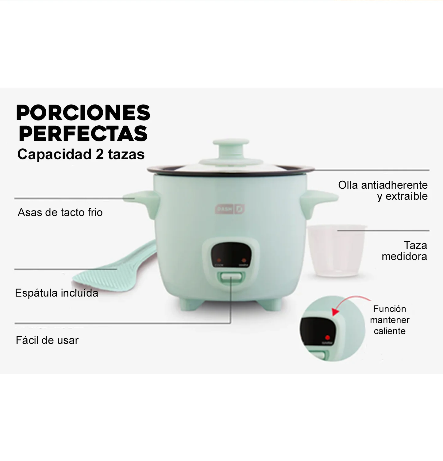 – La capacidad de 2 tazas (cocidas) permite controlar las porciones de manera más saludable o un desayuno, almuerzo, cena, refrigerios o acompañamientos individuales y rápidos y fáciles.