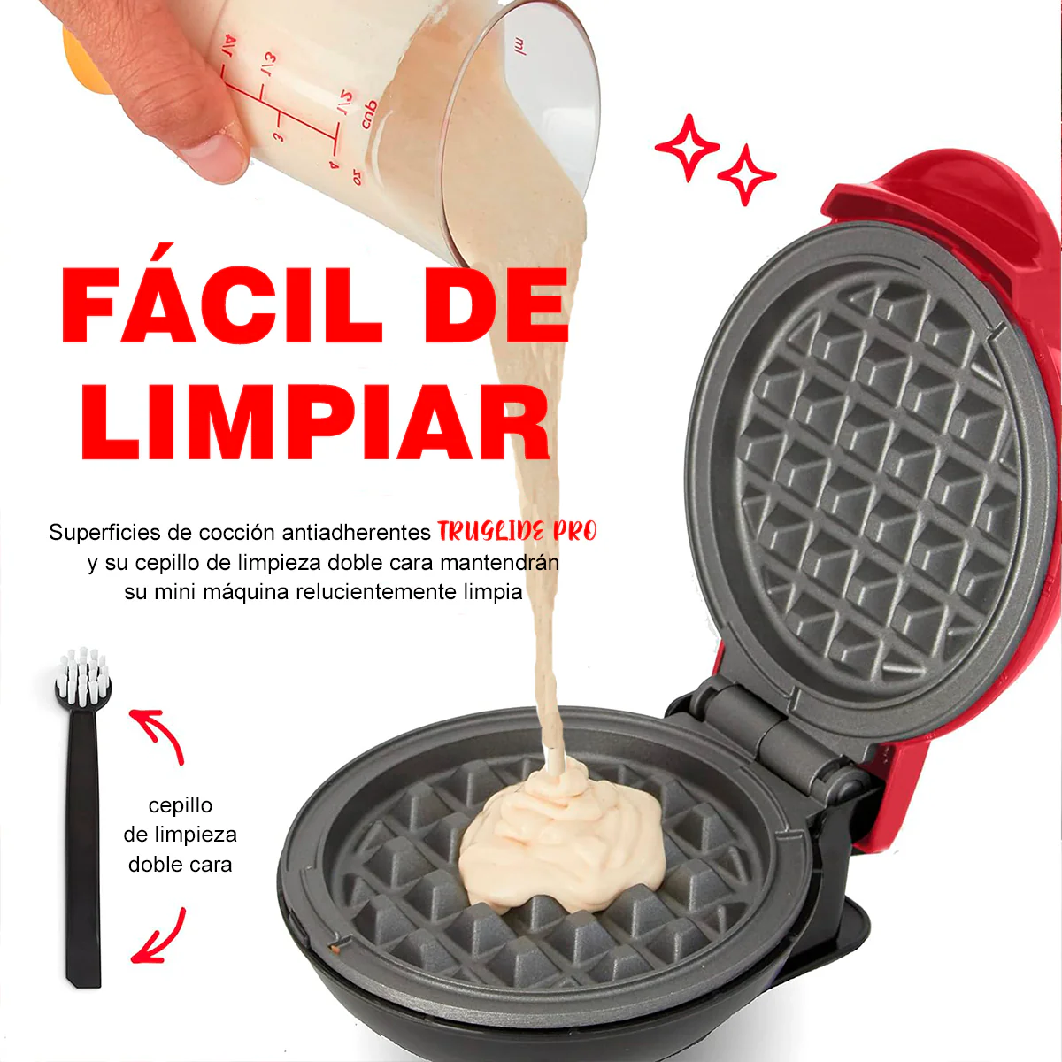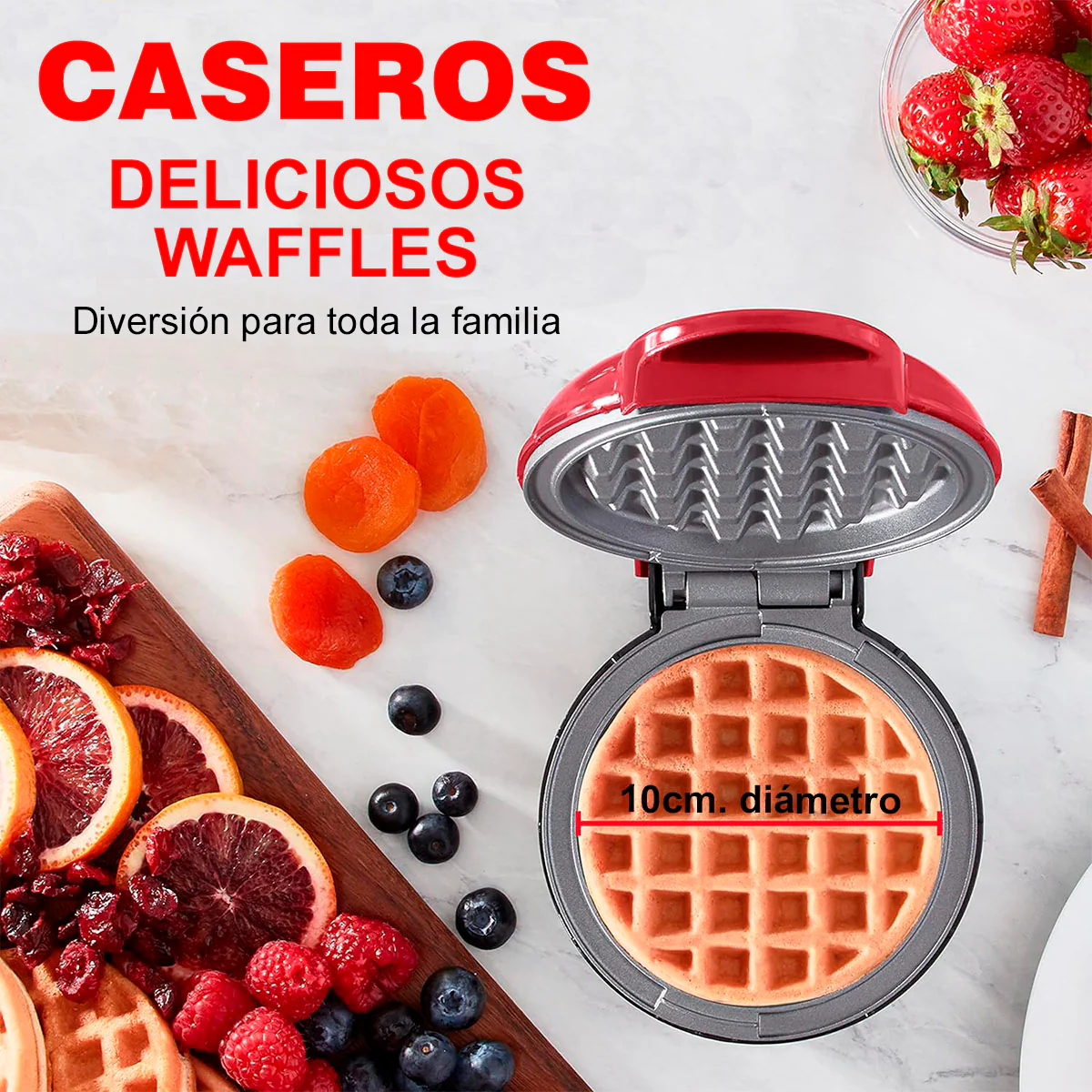 – Se calienta rápido y parejito: la superficie de 10 cm cocina tus waffles en minutos sin que se quemen.