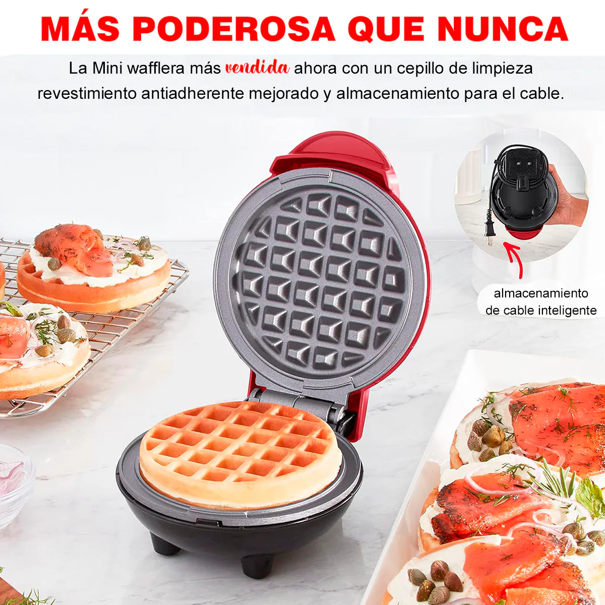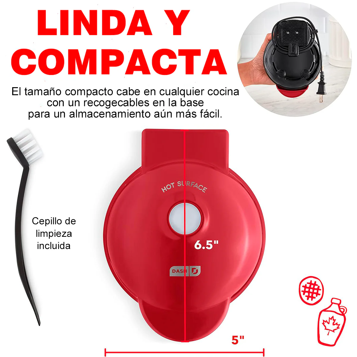 -Con un tamaño compacto y diseño sencillo, es perfecta para preparar waffles o hash browns caseros en pocos minutos.