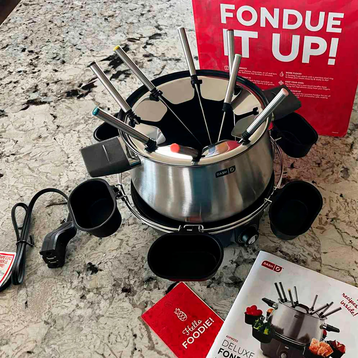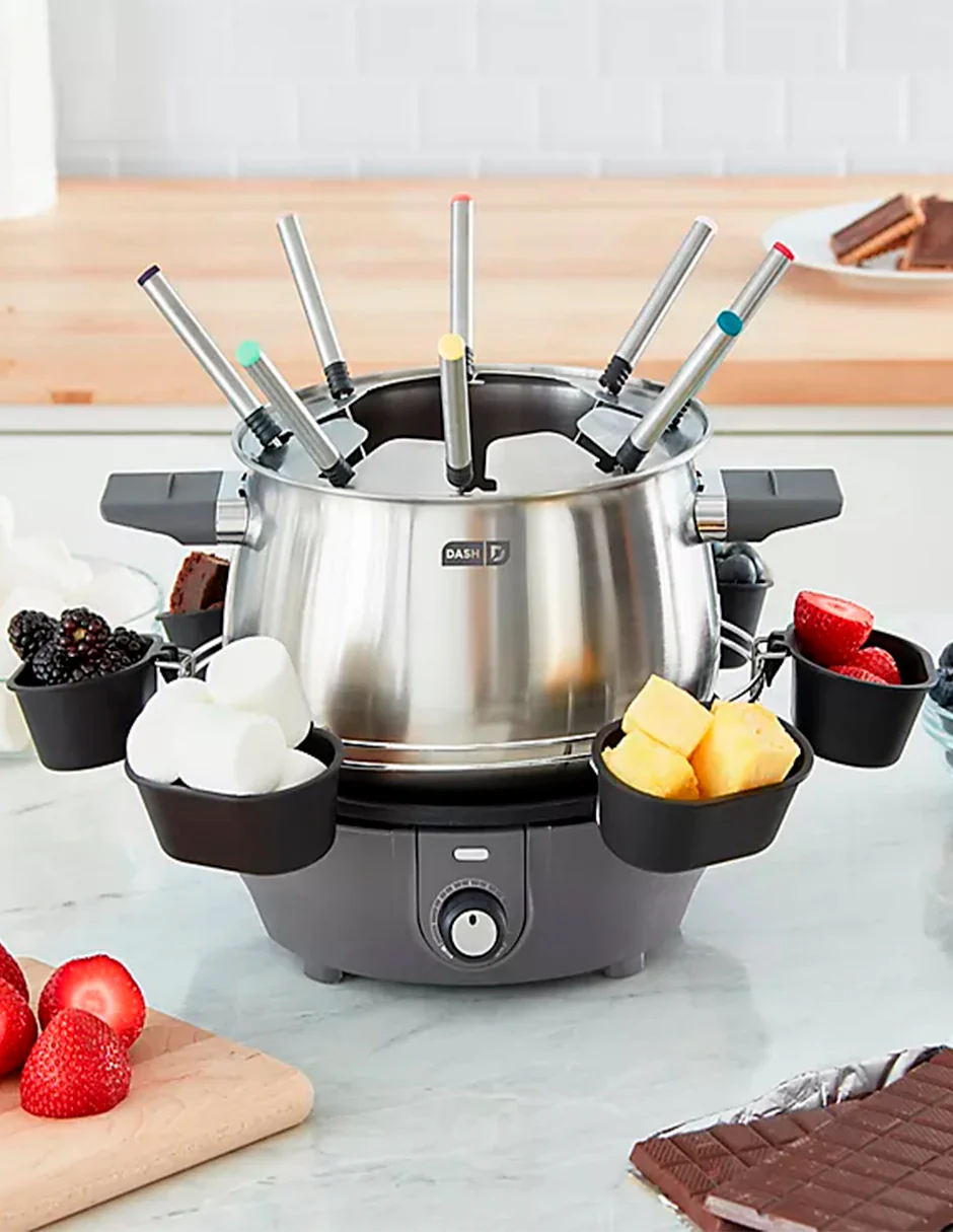 Dash – Olla Para Fondue – Acero Inoxidable Con 8 Tenedores – Control de Temperatura – Incluye Tenedores, Tazas, Estante y Guía de Recetas – Capacidad 750 ml – Color Gris
