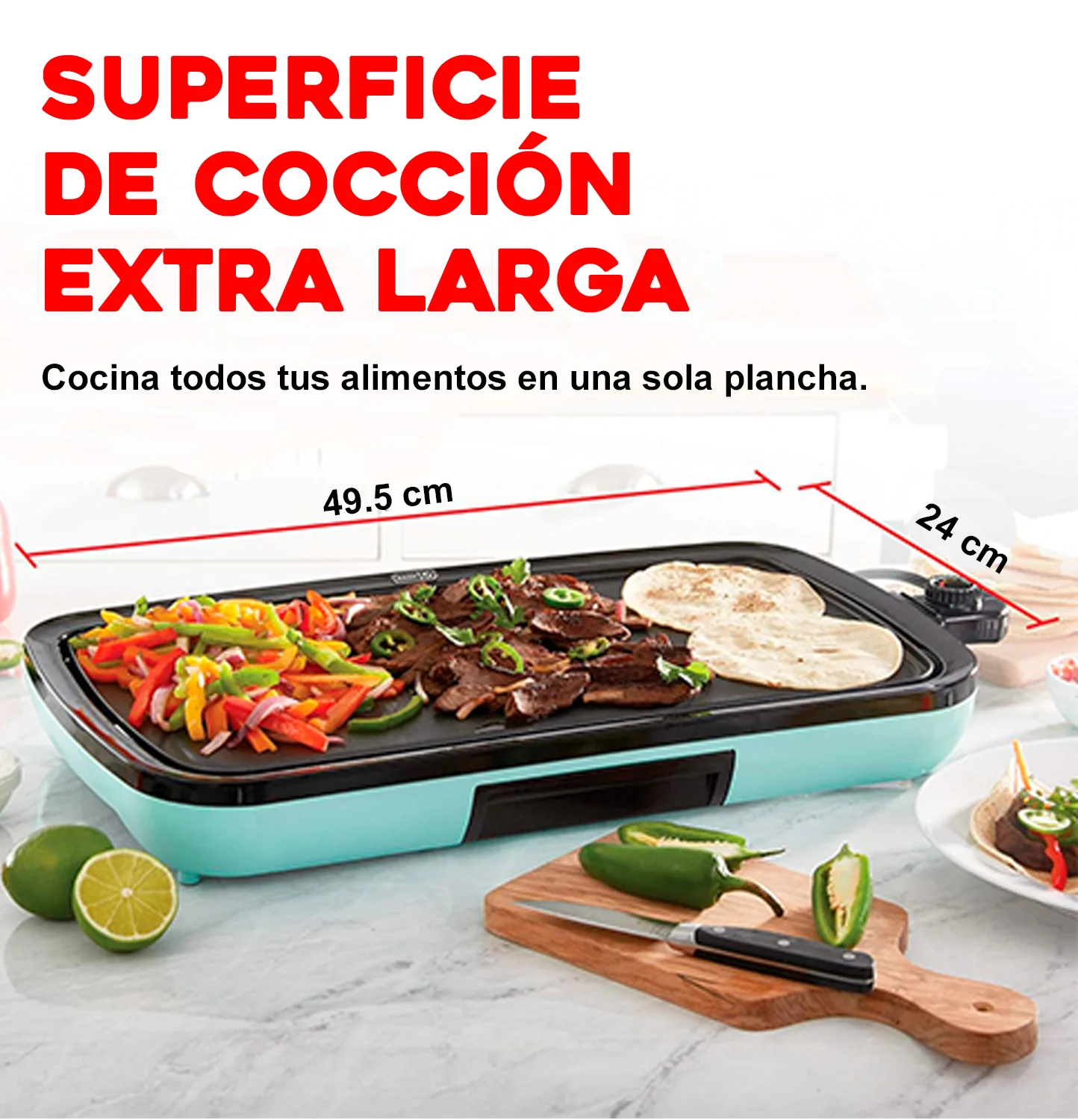 – Amplia superficie de cocción: mide 49.5 x 24 cm esta plancha eléctrica es perfecta para comidas familiares, entretenimiento o cocinar una variedad de alimentos para comedores exigentes a la vez.