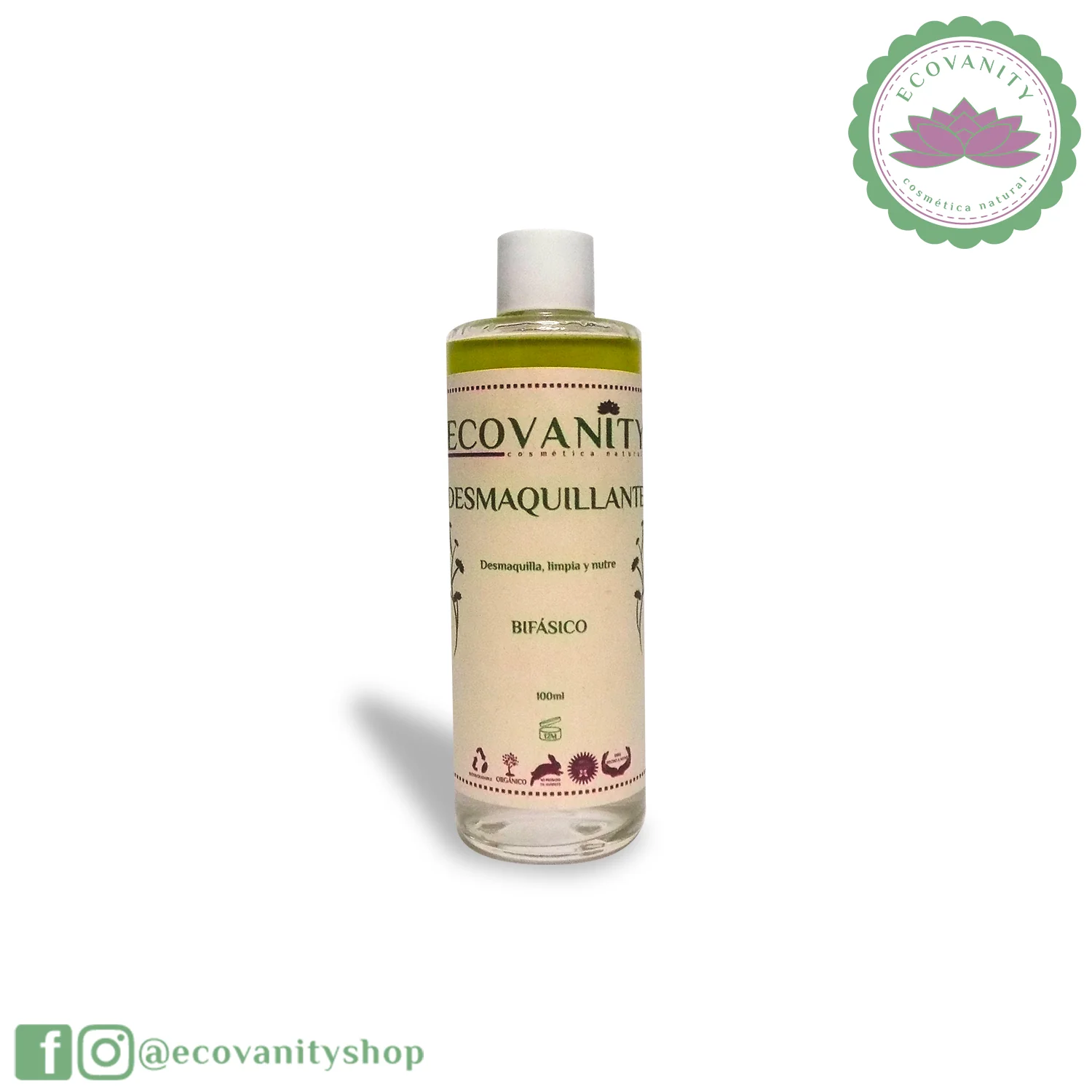 Desmaquillante Bifásico orgánico y natural, que hidrata y limpia la piel. 100ml