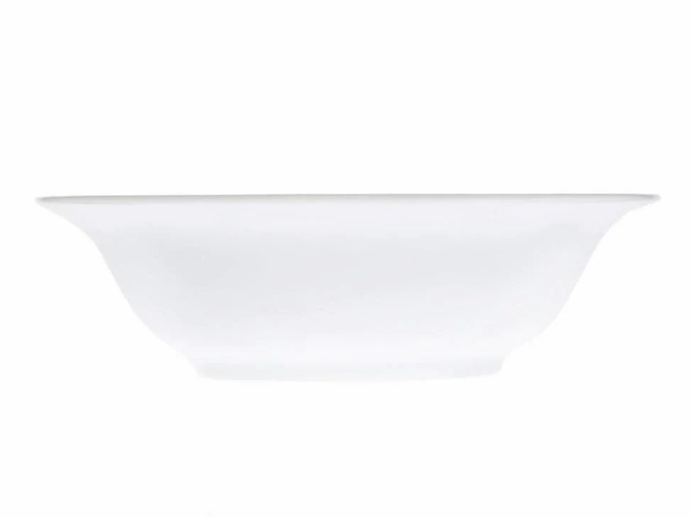 Diseño contemporáneo en blanco con un sutil borde circular en relieve sobre un cuerpo de porcelana fina blanca.