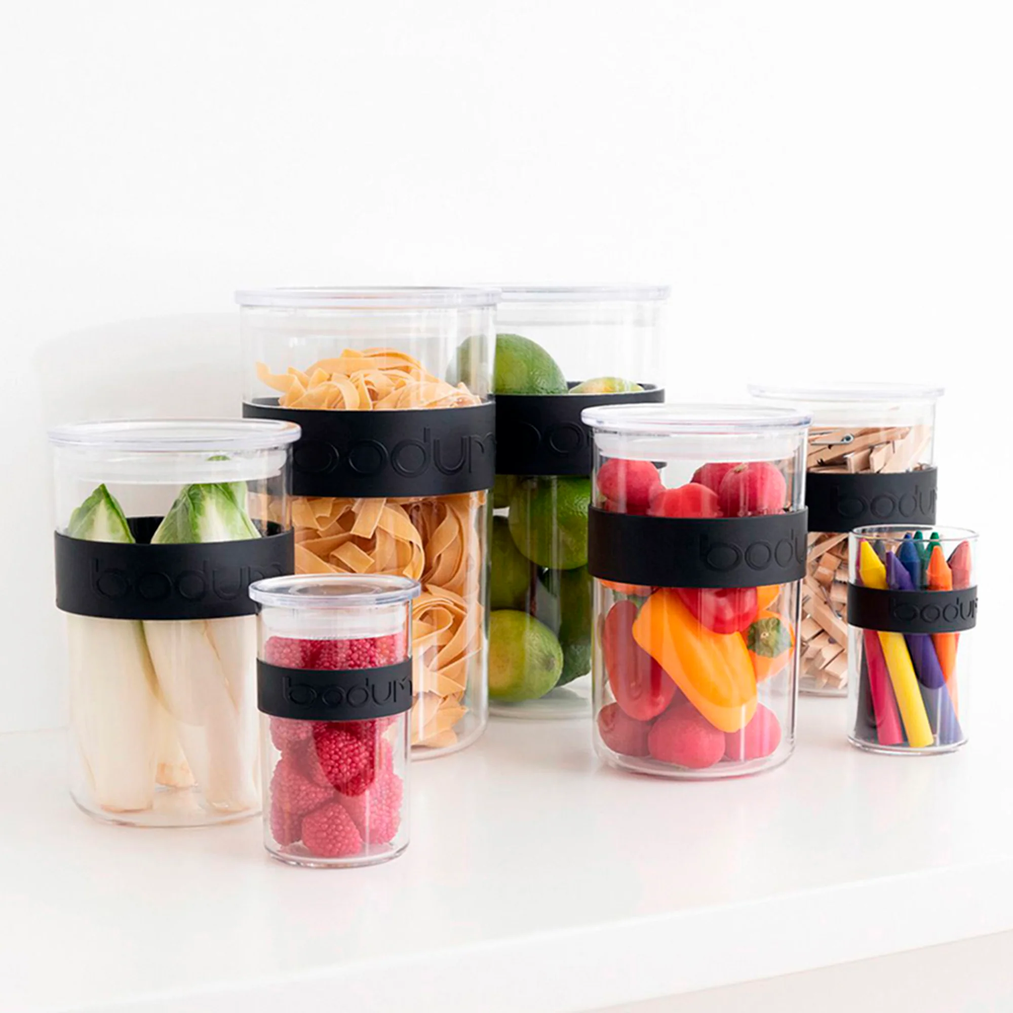 Versátiles y flexibles, estos tarros de almacenamiento de plástico son los recipientes ideales para cereales, pasta, harina, azúcar, nueces, frijoles, café, té y otros alimentos, y son perfectos para almacenar varios líquidos. Una banda rodea los frascos que ofrecen un agarre cómodo y un toque de color, y personifican la creencia de Bodum de que un buen diseño debe ser asequible.