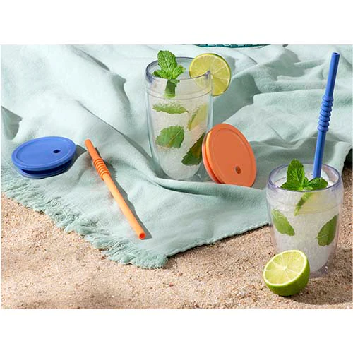 - Juego de vasos de doble pared con tapa, perfectos para disfrutar de un aperitivo o una bebida mientras estás en marcha.
