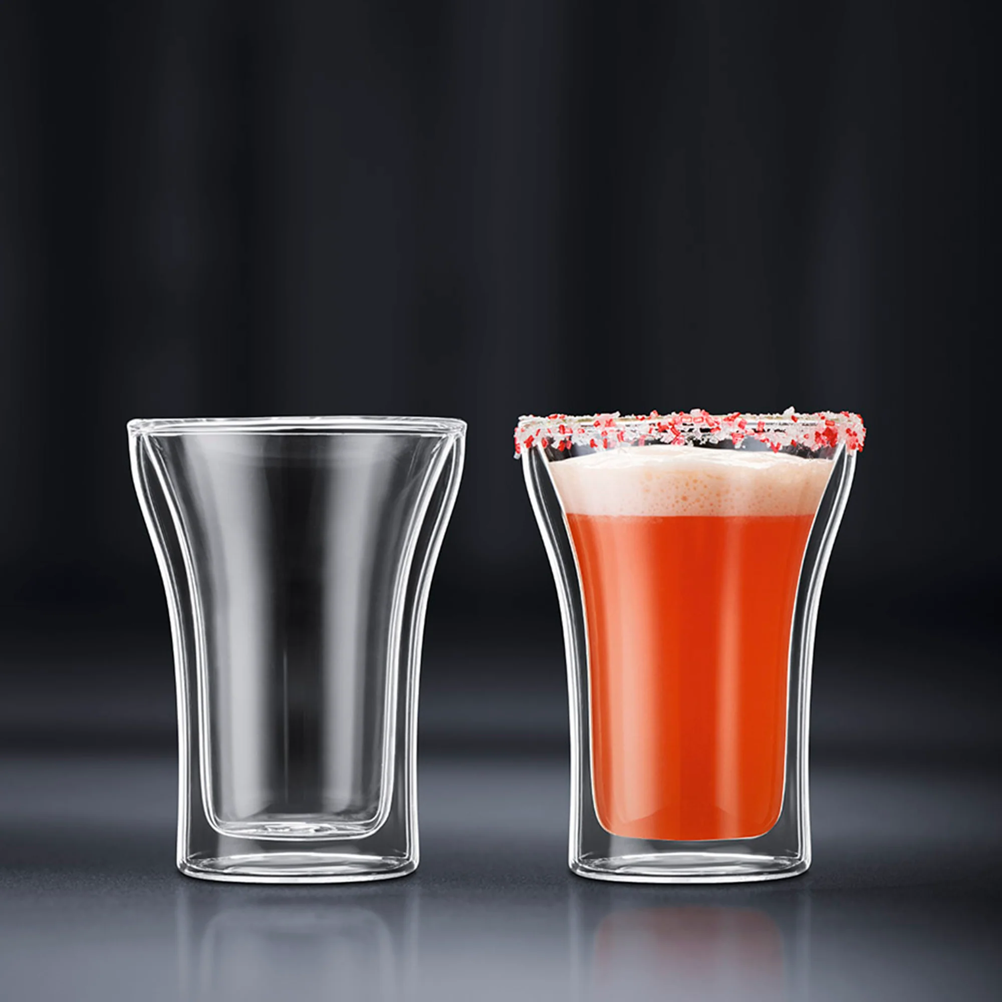 Soplados individualmente por expertos artesanos, estos vasos de doble aislamiento están hechos con dos capas de vidrio de borosilicato resistente al calor, este material mantiene las bebidas, calientes y frías, a su temperatura ideal durante más tiempo.