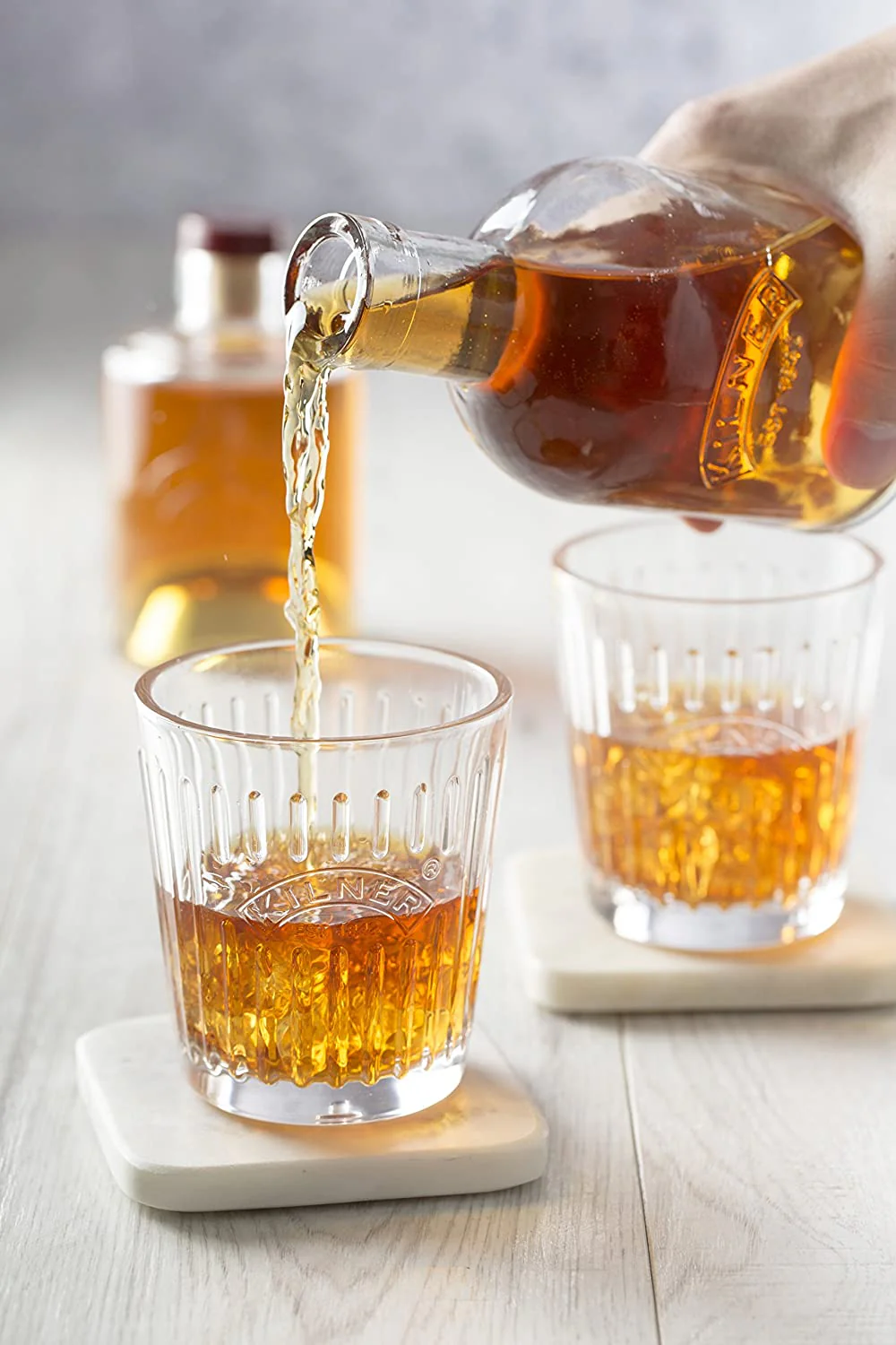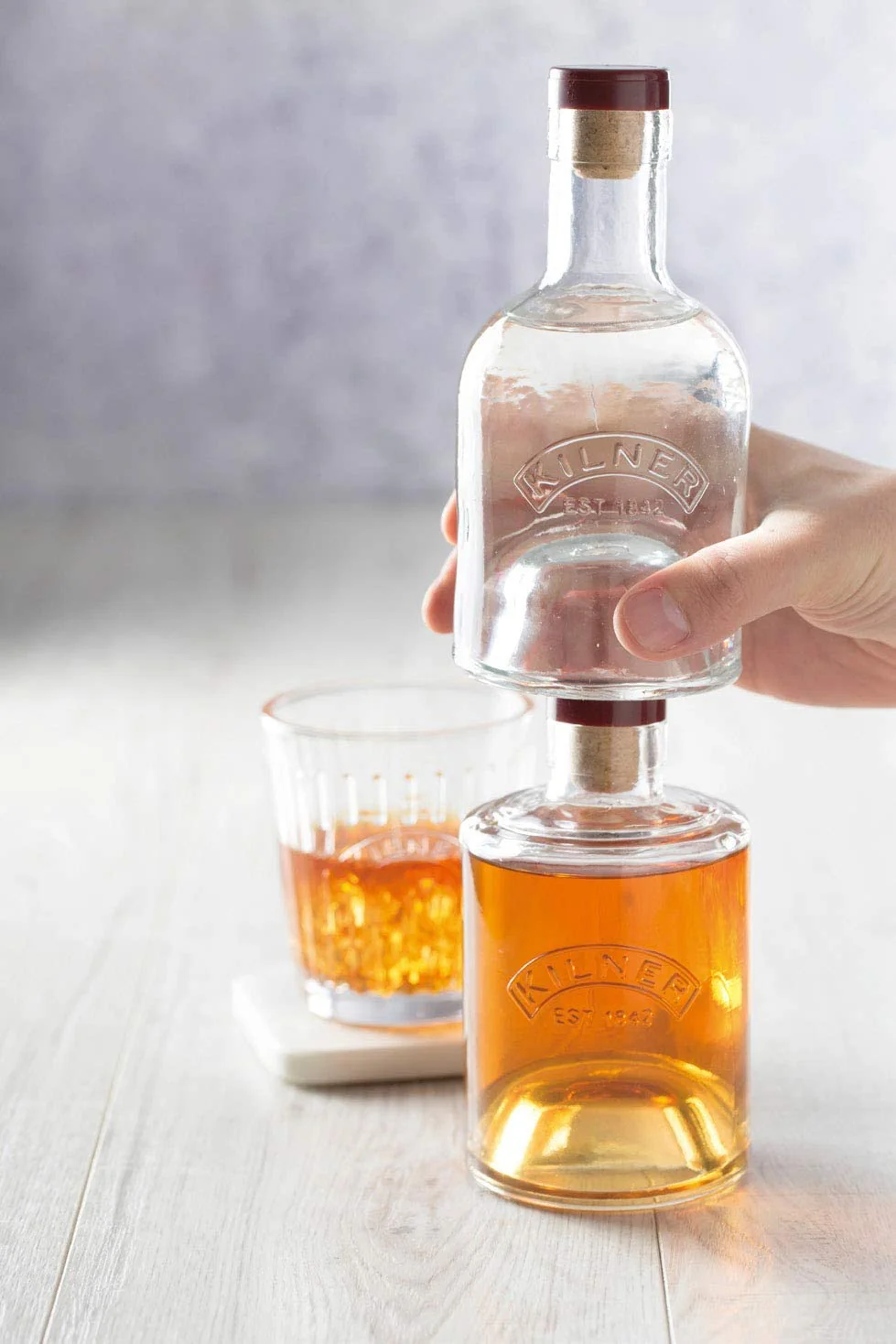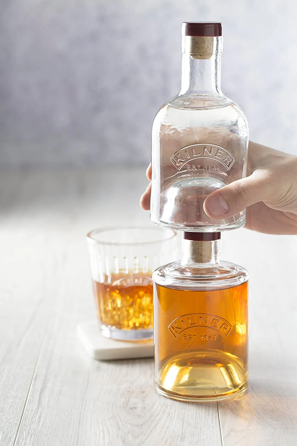 -Entonces, ya sea que almacene aceite y vinagre o whisky y agua, se apilarán convenientemente, ahorrando espacio en su cocina.
