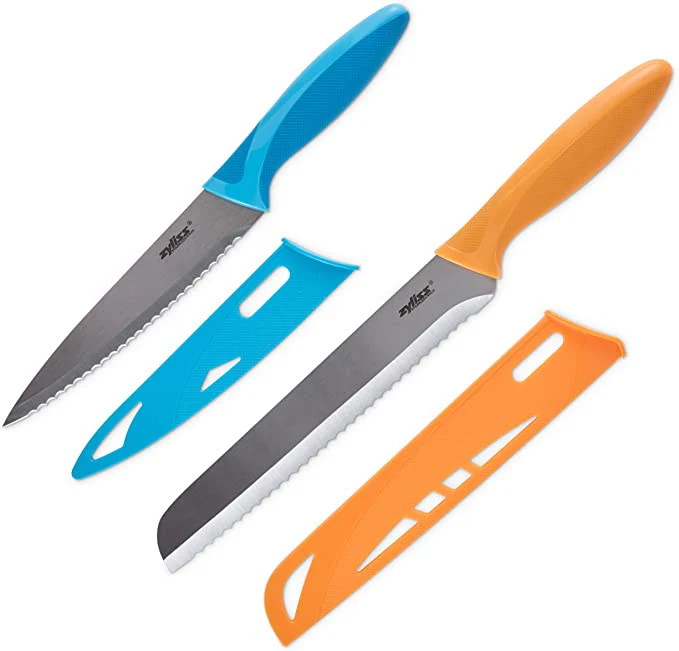 El juego de cuchillos dentados de 2 piezas Zyliss es una excelente selección para el chef principiante o experimentado. Los cuchillos dentados Zyliss están recubiertos de acero inoxidable japonés que acentúa los bordes afilados y el uso prolongado. La inclusión de manijas ergonómicas y empuñaduras de goma suaves al tacto reducen la fatiga de la mano y permiten un corte de precisión. Una adición natural para cocinas, casas rodantes, botes, picnics y viajes de campamento, estos cuchillos incluyen cubiertas de hojas a juego que los mantendrán afilados y seguros para viajar.