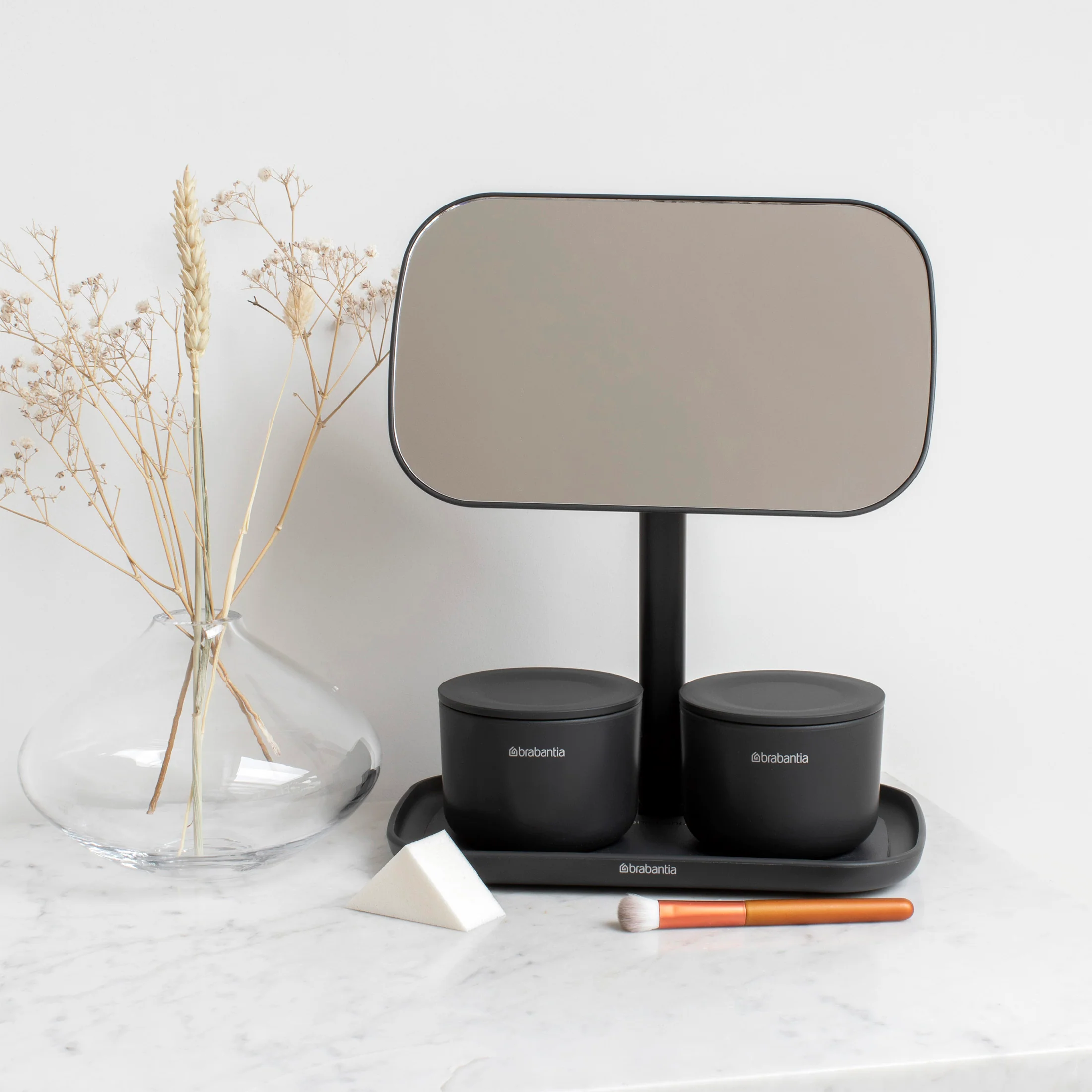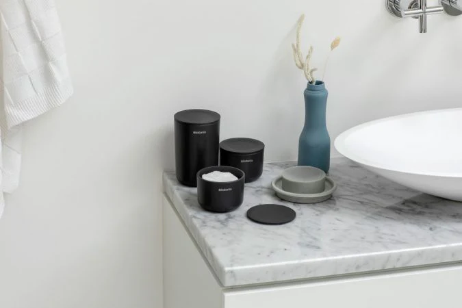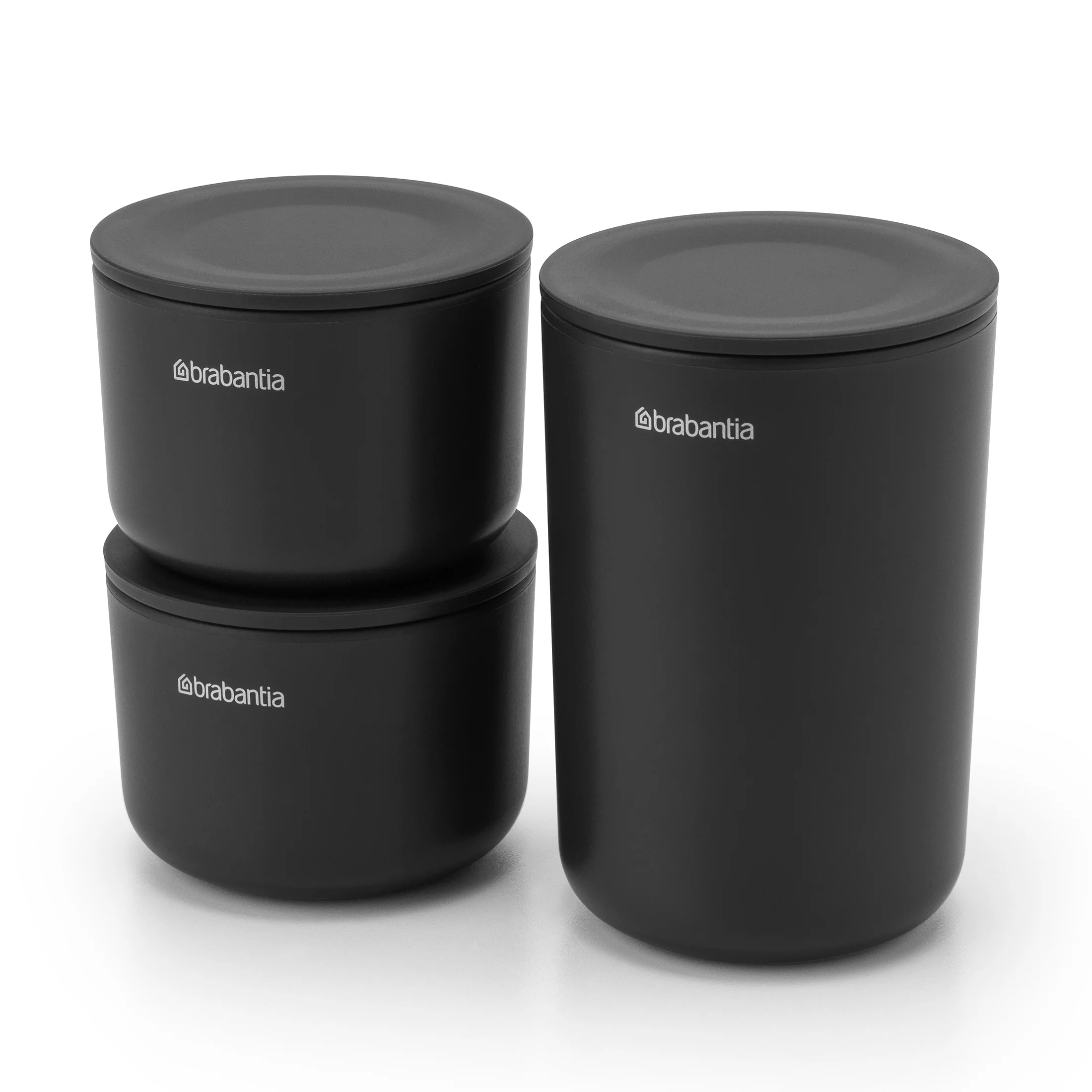 Son las pequeñas cosas las que nos hacen felices. Como este juego de 3 botes de almacenaje ReNew de Brabantia. Dos alegres botes para pinzas del pelo, pendientes y todas esas pequeñas cosas que quieres guardar juntas. El bote más grande es perfecto para discos de algodón o bastoncillos. Apílalos, almacénalos, ámalos.