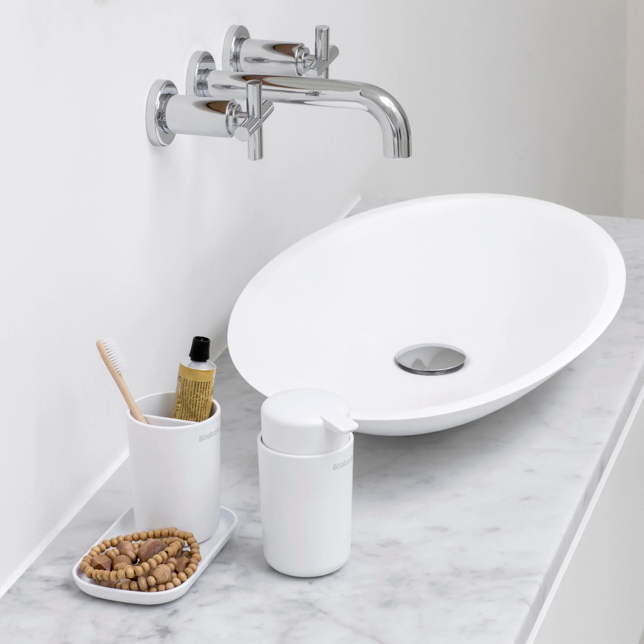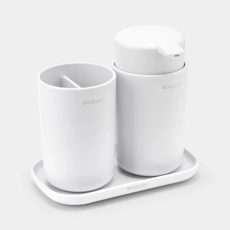 Convierte tu baño en un oasis de paz con este estiloso juego de tres accesorios para el baño ReNew de Brabantia. El dispensador de jabón de fácil llenado te permite tener tu jabón favorito siempre a mano, mientras que el vaso para los cepillos tiene también espacio para la pasta. La bandeja la puedes utilizar para guardar pequeñas cosas o como soporte de los otros dos. Un baño bonito y perfectamente organizado con sólo contar hasta tres.