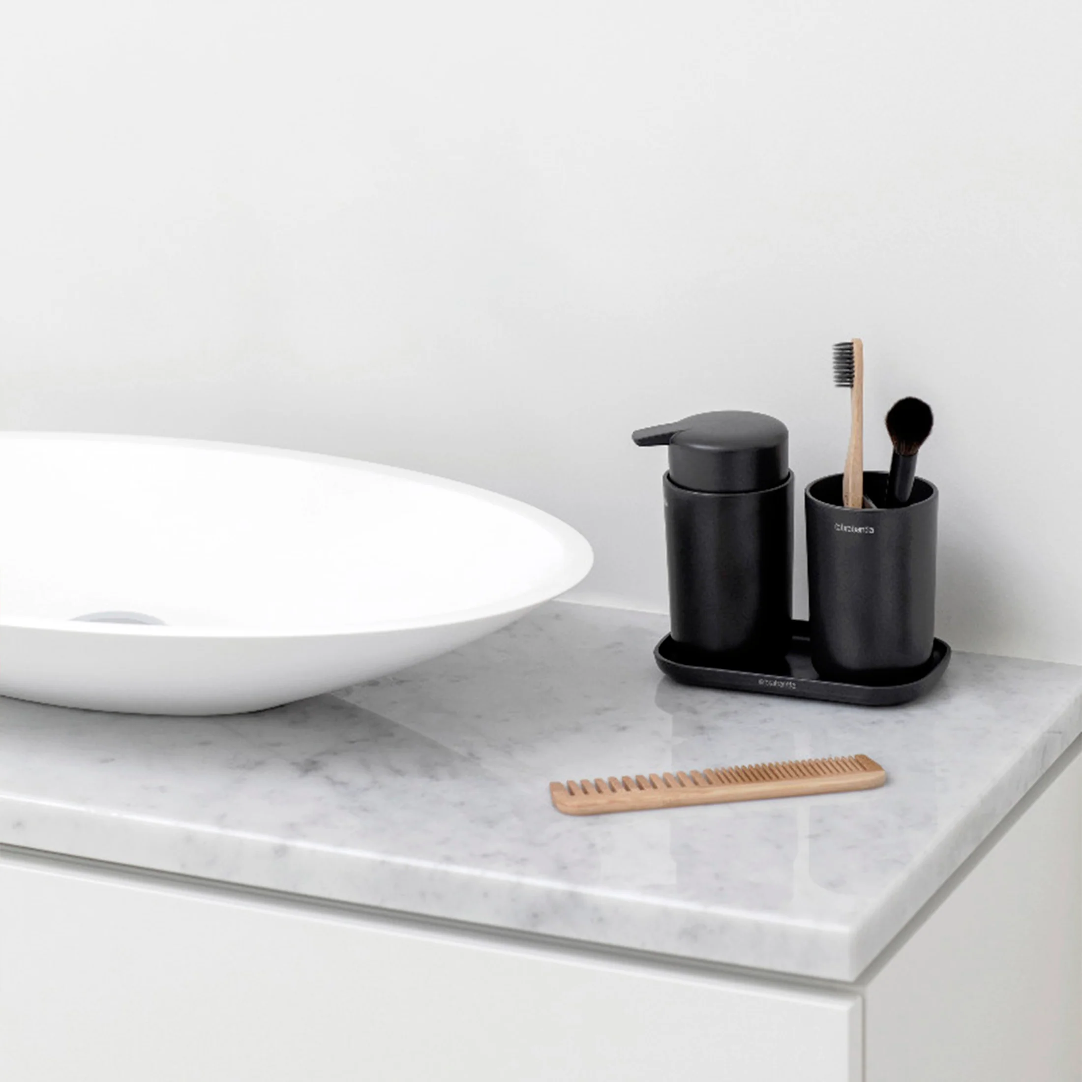 Convierte tu baño en un oasis de paz con este estiloso juego de tres accesorios para el baño ReNew de Brabantia. El dispensador de jabón de fácil llenado te permite tener tu jabón favorito siempre a mano, mientras que el vaso para los cepillos tiene también espacio para la pasta. La bandeja la puedes utilizar para guardar pequeñas cosas o como soporte de los otros dos. Un baño bonito y perfectamente organizado con sólo contar hasta tres.