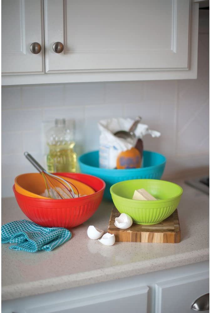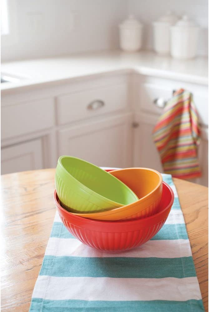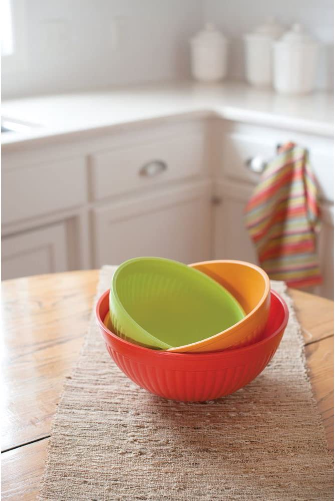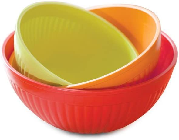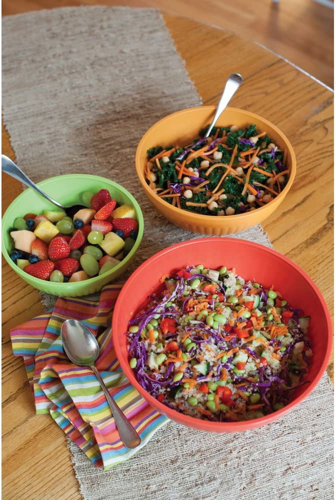 Especialmente diseñado para que todos los tazones y tapas encajen perfectamente juntos para un fácil almacenamiento. Con empuñaduras ergonómicas en las tapas y fondos antideslizantes en los tazones. PLÁSTICO verde naranja rojo.