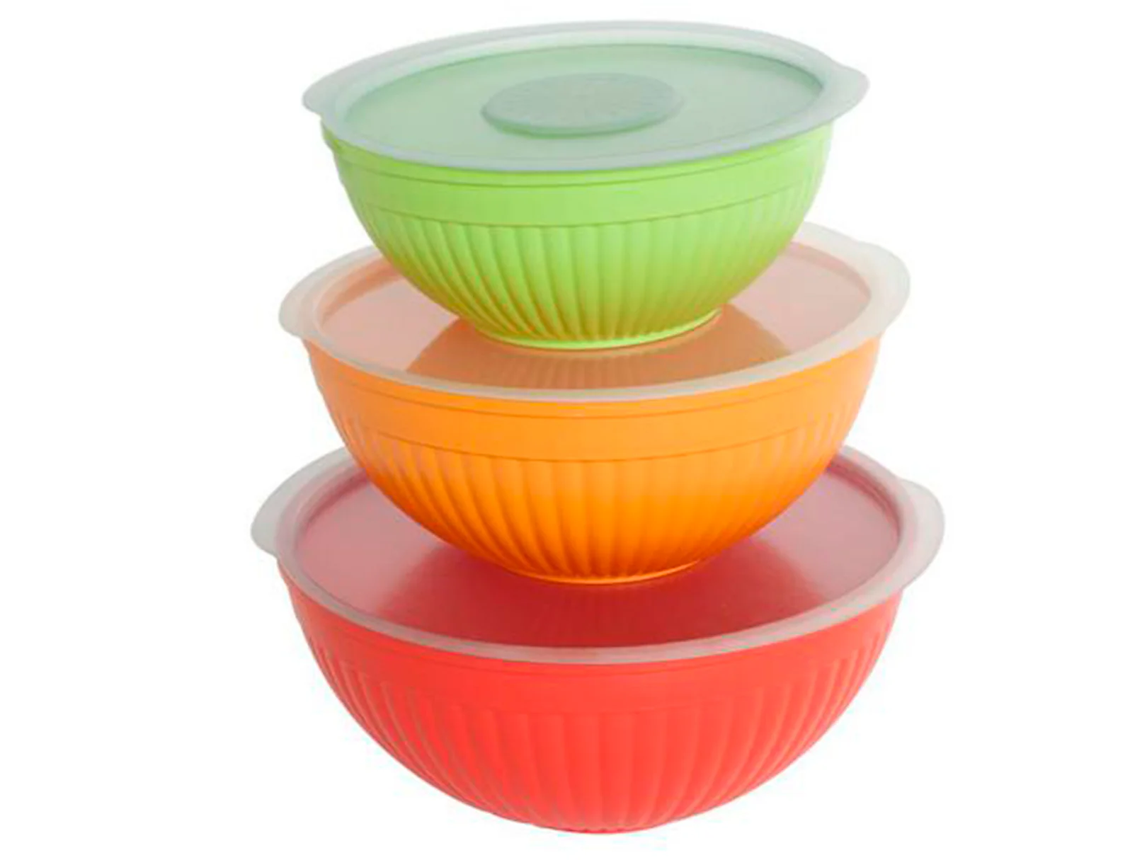 El Juego de Tazones Cubiertos de 6 Piezas incluye un Tazón de 2 Qt 3.5 Qt y 5 Qt con tapas. ¡Nuestros populares tazones aptos para microondas para preparar y servir ahora vienen con tapas!