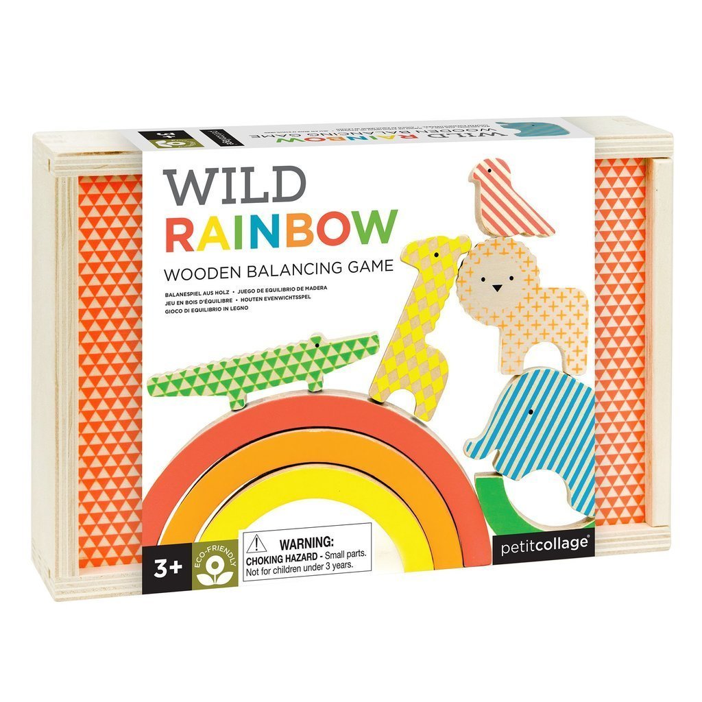 Juego de equilibrio con arcoíris y animales de madera.
