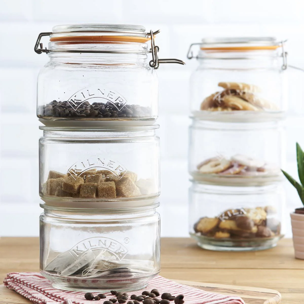 - TARROS APILABLES | Mantenga limpias las encimeras, las despensas y las alacenas con el juego de tarros apilables de Kilner. Estos tres tarros ofrecen la solución perfecta para mantener los alimentos secos frescos durante más tiempo.