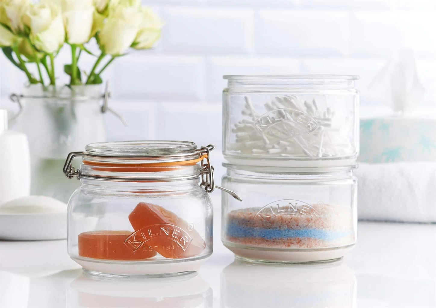 - TAMAÑO | El juego de frascos apilables Kilner incluye un frasco con tapa de clip de 0,9 litros y dos frascos con tapa a presión de 0,88 litros.