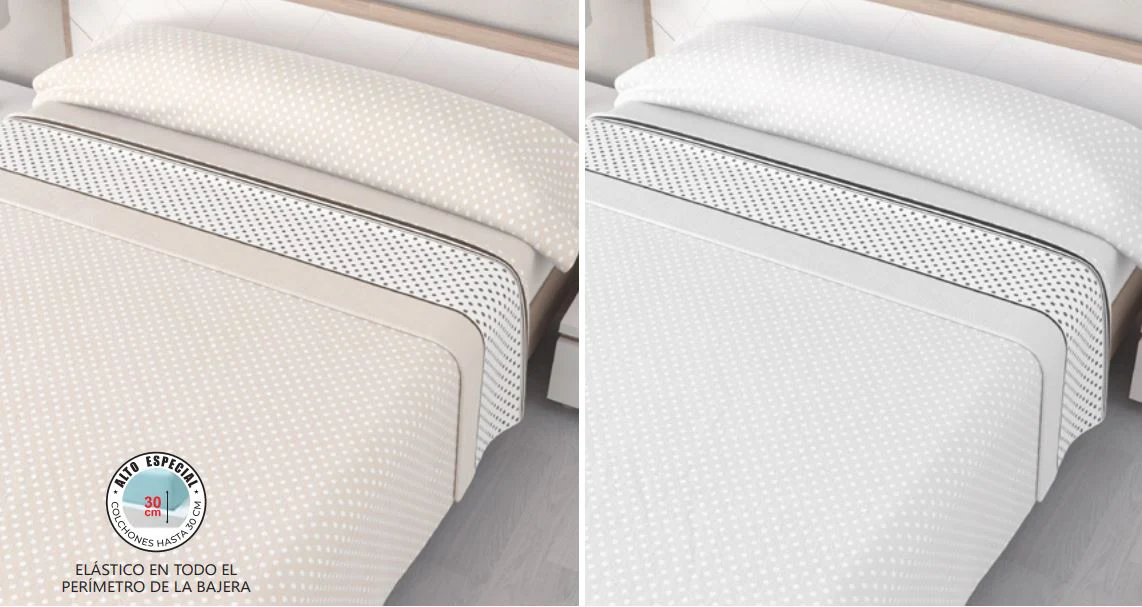 Viste tu cama con el juego de sábanas Manaos, elige entre los tonos gris o beige según tu preferencia, y disfruta de noches de descanso envuelto en suavidad.