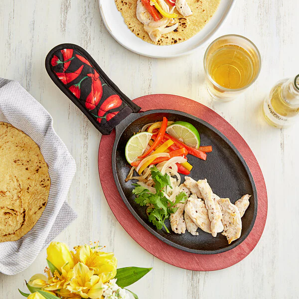 ¡Sirva fajitas chisporroteantes con estilo con esta sartén para fajitas ovalada de hierro fundido previamente sazonada Lodge LFSR3 de 10″ x 7 1/2″ con revestimiento de madera roja y soporte para mango de chile! Esta sartén pasa fácilmente del horno a la mesa para un servicio rápido y eficiente. Además, para evitar que el calor dañe las mesas y las encimeras, el forro de madera rojo chile incluido ofrece una capa adicional de protección para un manejo más seguro de sus ofertas calientes.