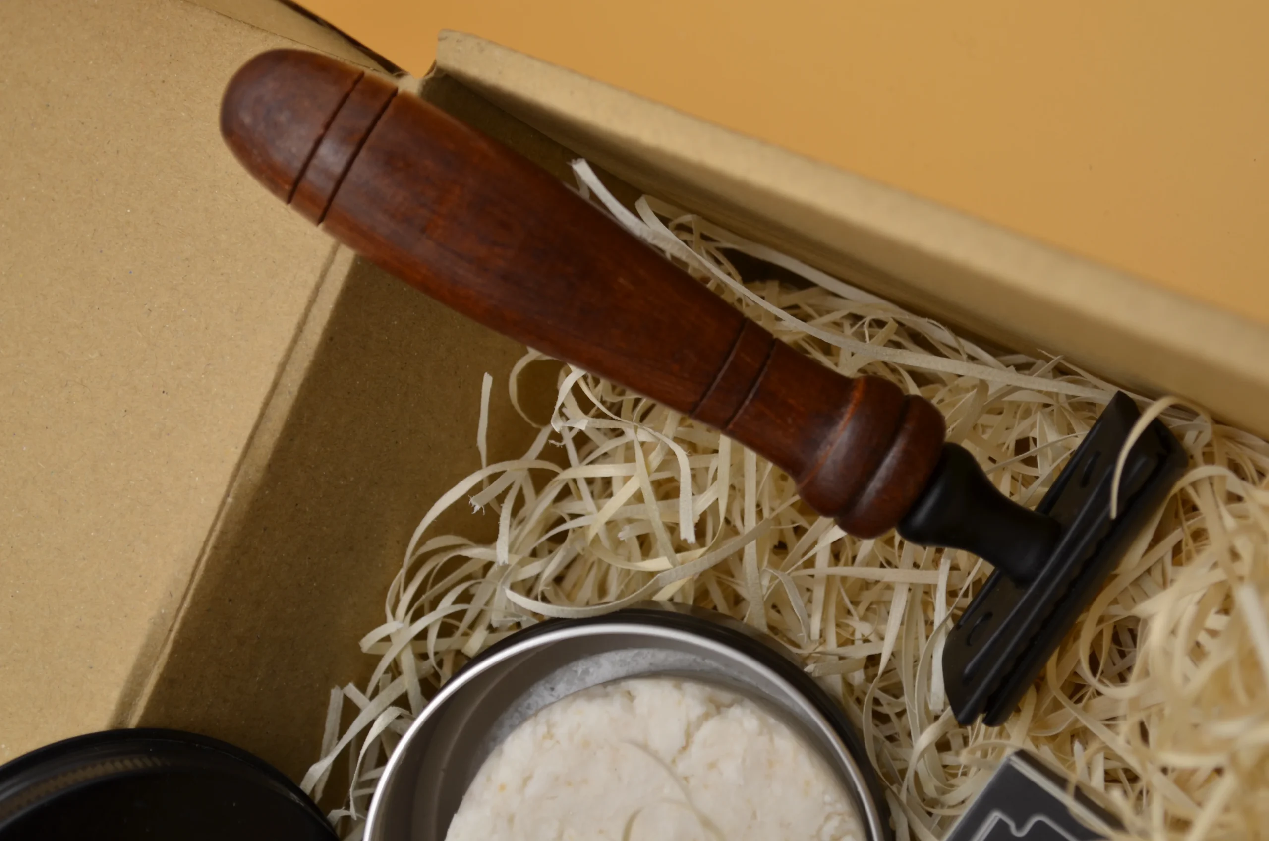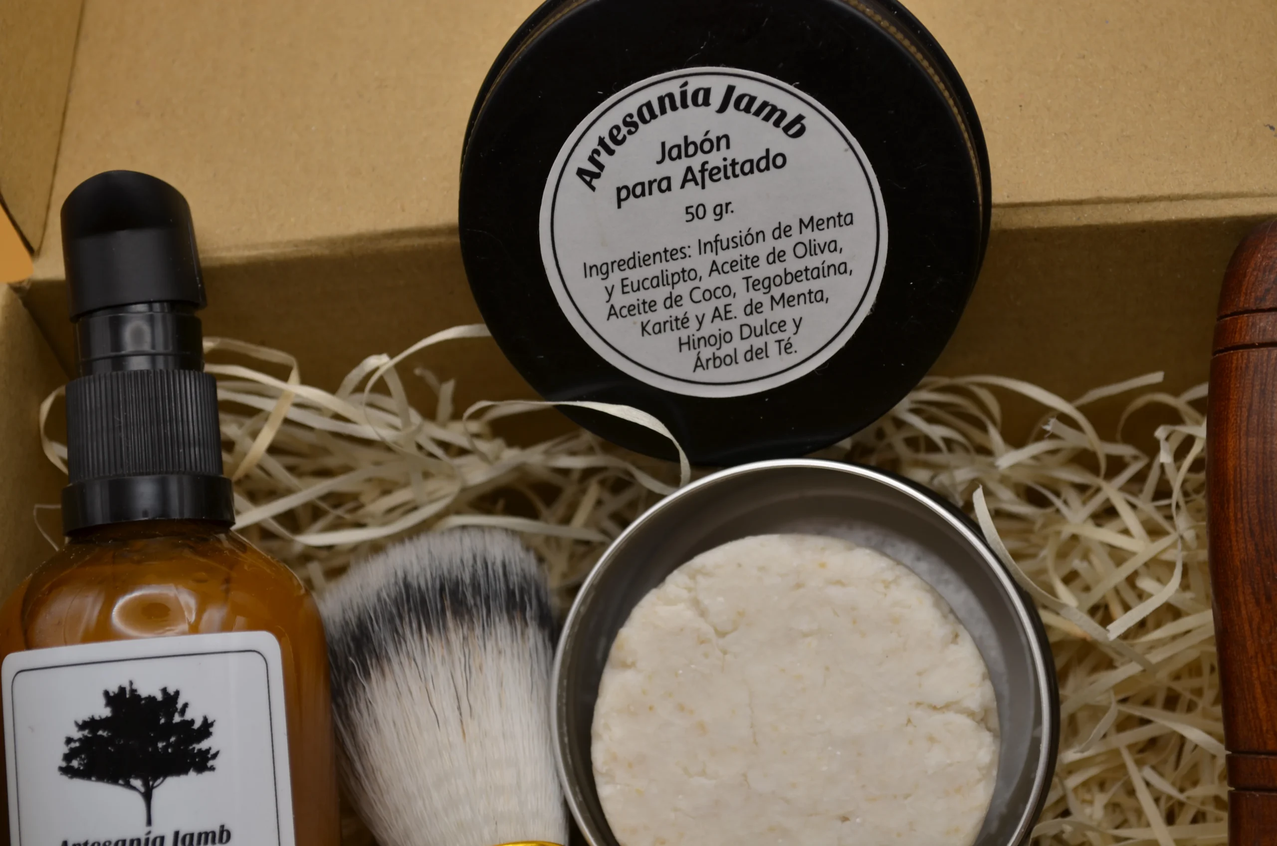 Nuestro kit para el afeitado consta de un jabón natural elaborado con aceites vegetales puros y una brocha de suave y abundante pelo que nos ayudará a espumar bien el jabón. Además contiene un After Shave natural en forma de Agua Floral, que nos ayudará a cicatrizar posibles cortes y nos dará un efecto muy refrescante después del afeitado. El kit además trae una Maquina de Afeitar tradicional con 5 cuchillas de recambio. Todo ello, se presenta en un packaging especial de papel kraft que resulta ideal para hacer un regalo. Este jabón de afeitar se presenta en un tarro de 50 ml. y tiene una textura blandita para facilitar su aplicación. Entre sus numerosas propiedades, podemos destacar que genera una espuma muy suave y cremosa que mantendrá la piel perfectamente nutrida, y la frescura que aporta a la piel gracias a los aceites esenciales que contiene.