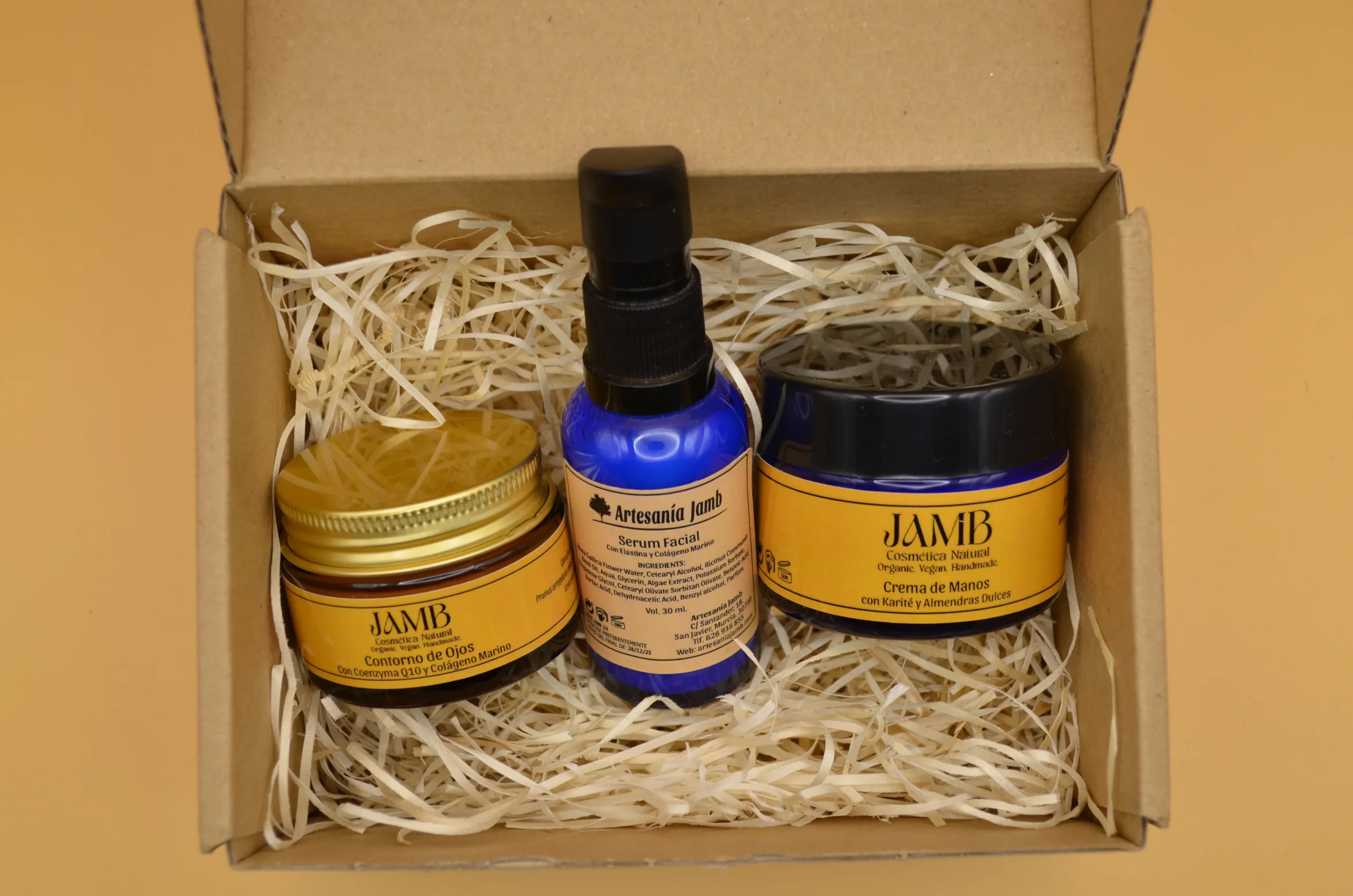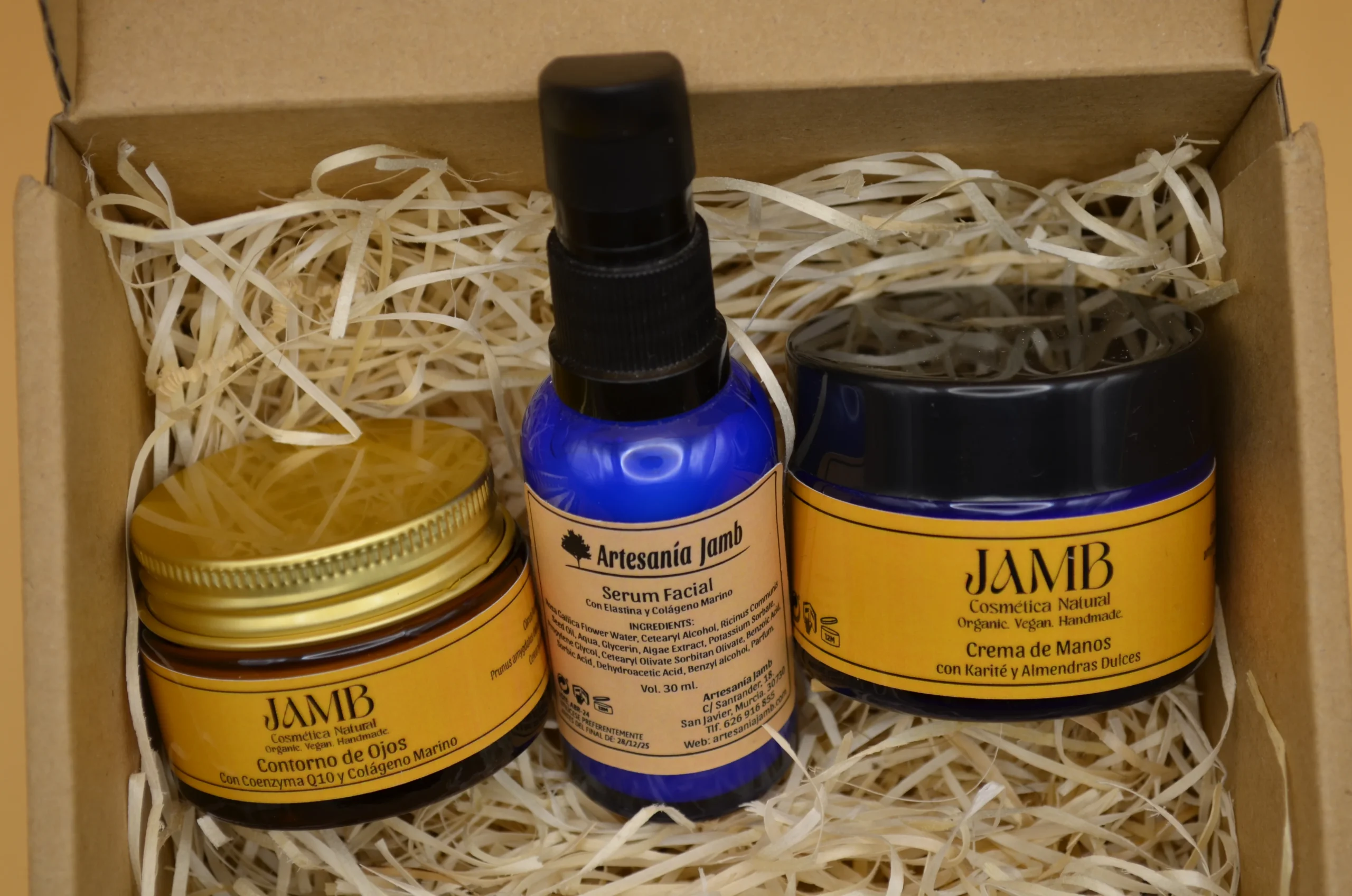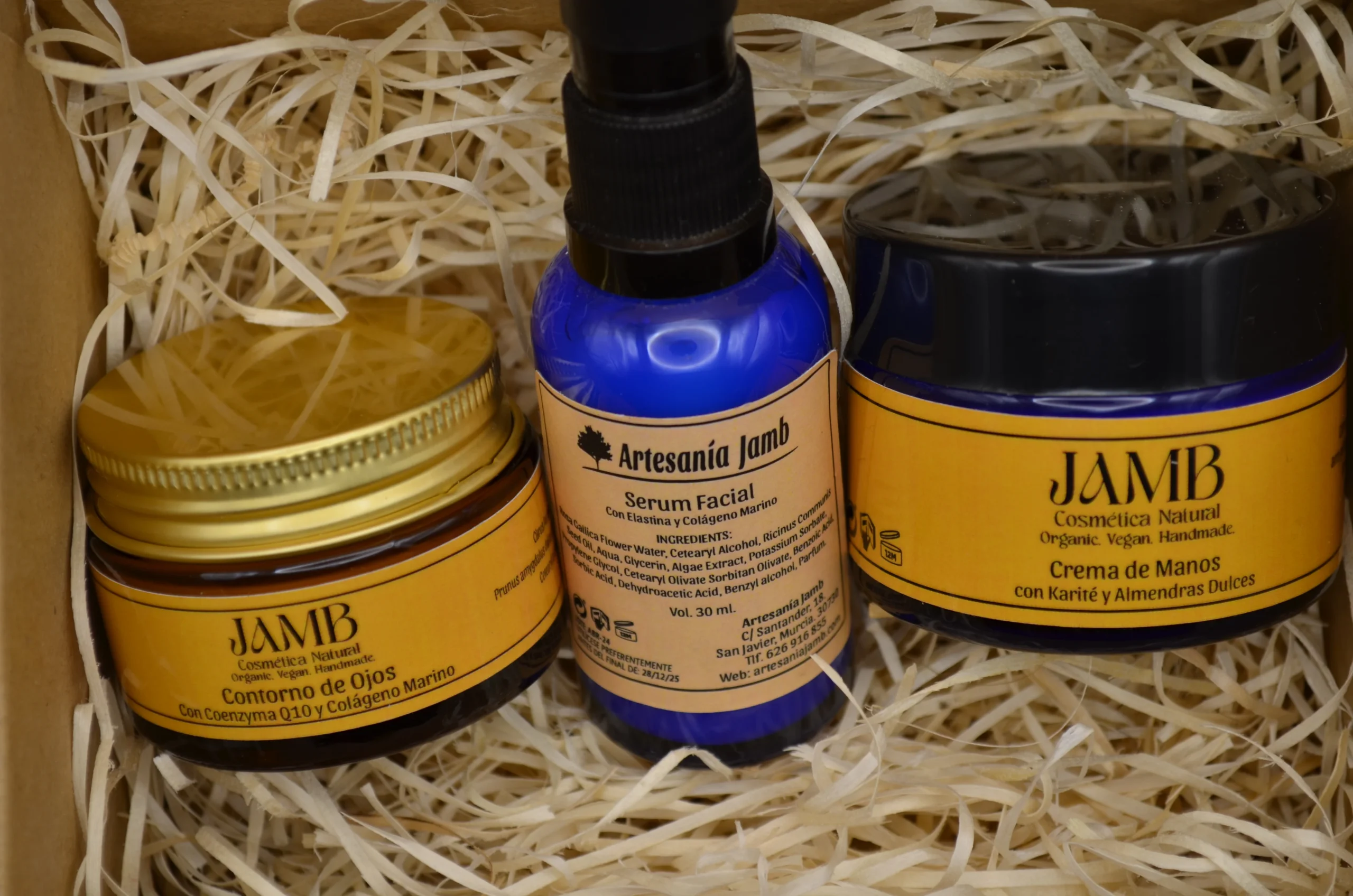 Este Kit Belleza está compuesto por 3 productos fundamentales de Artesanía Jamb: El Serum Facial con Elastina y Colágeno Marino; el Contorno de Ojos con Coenzyma Q10, Aceite de Argán y Colágeno Marino; y la Crema de Manos con Glicerina Vegetal, Karité y Aceite de Almendras Dulces.