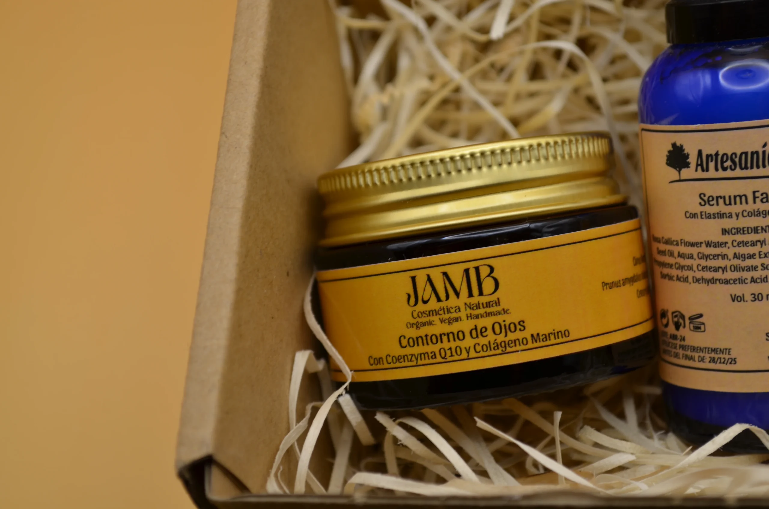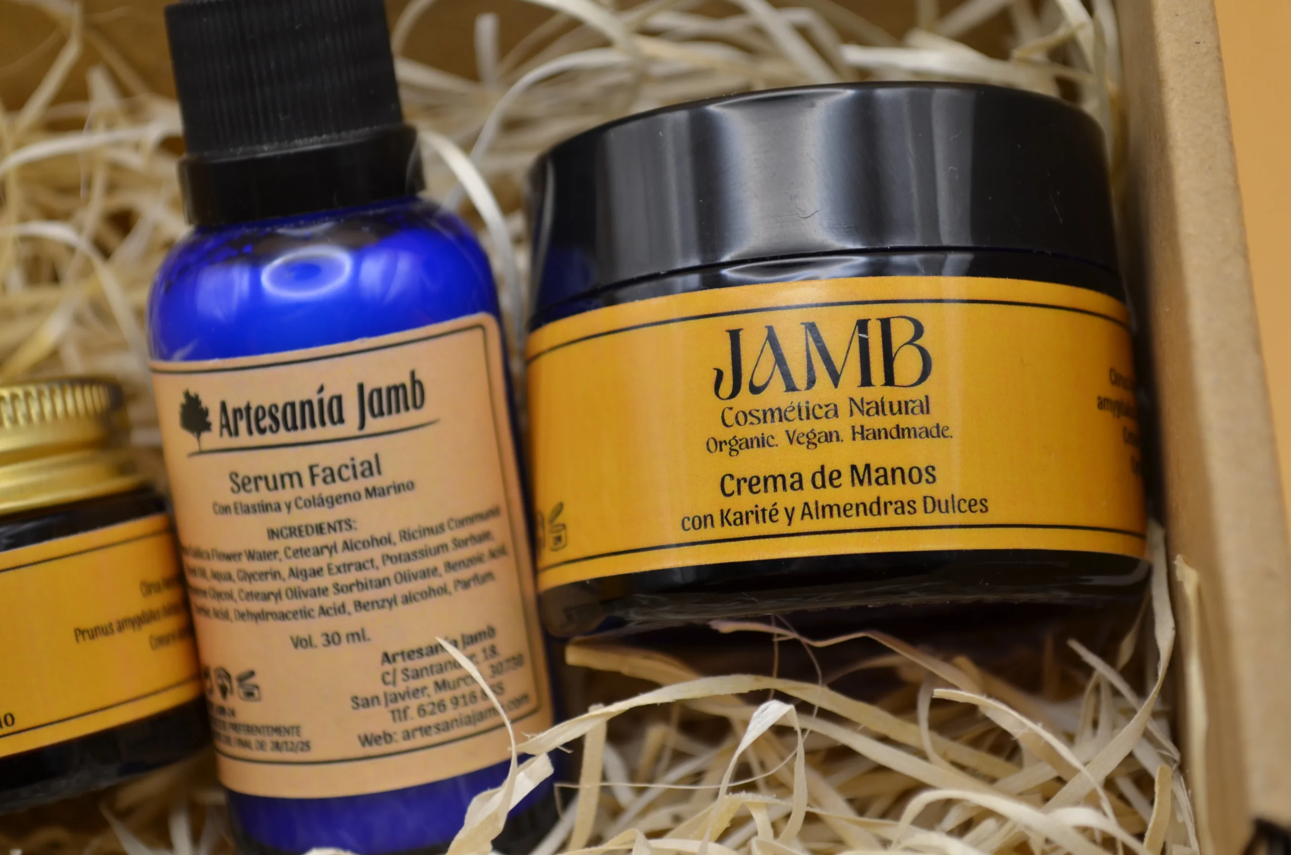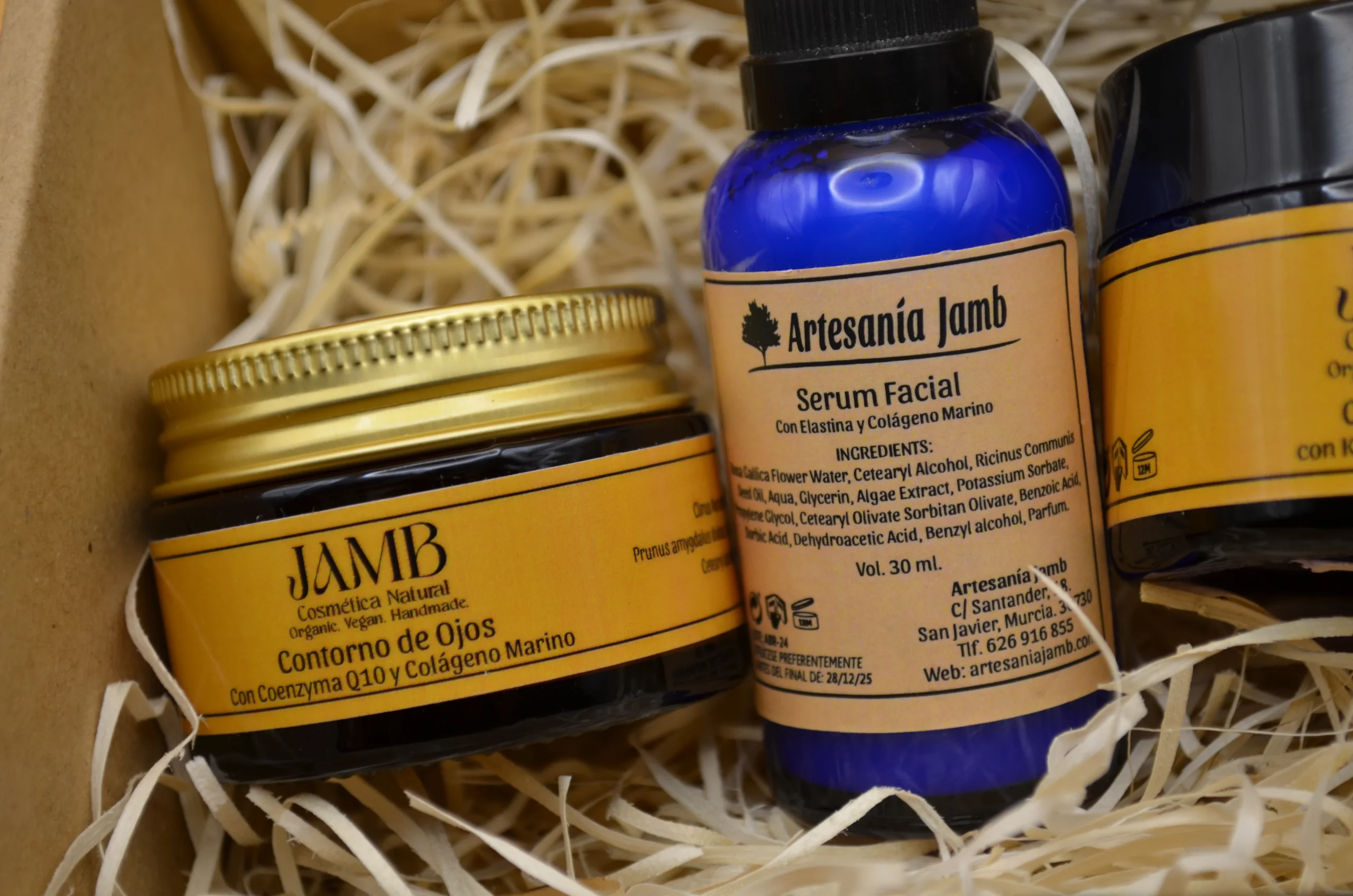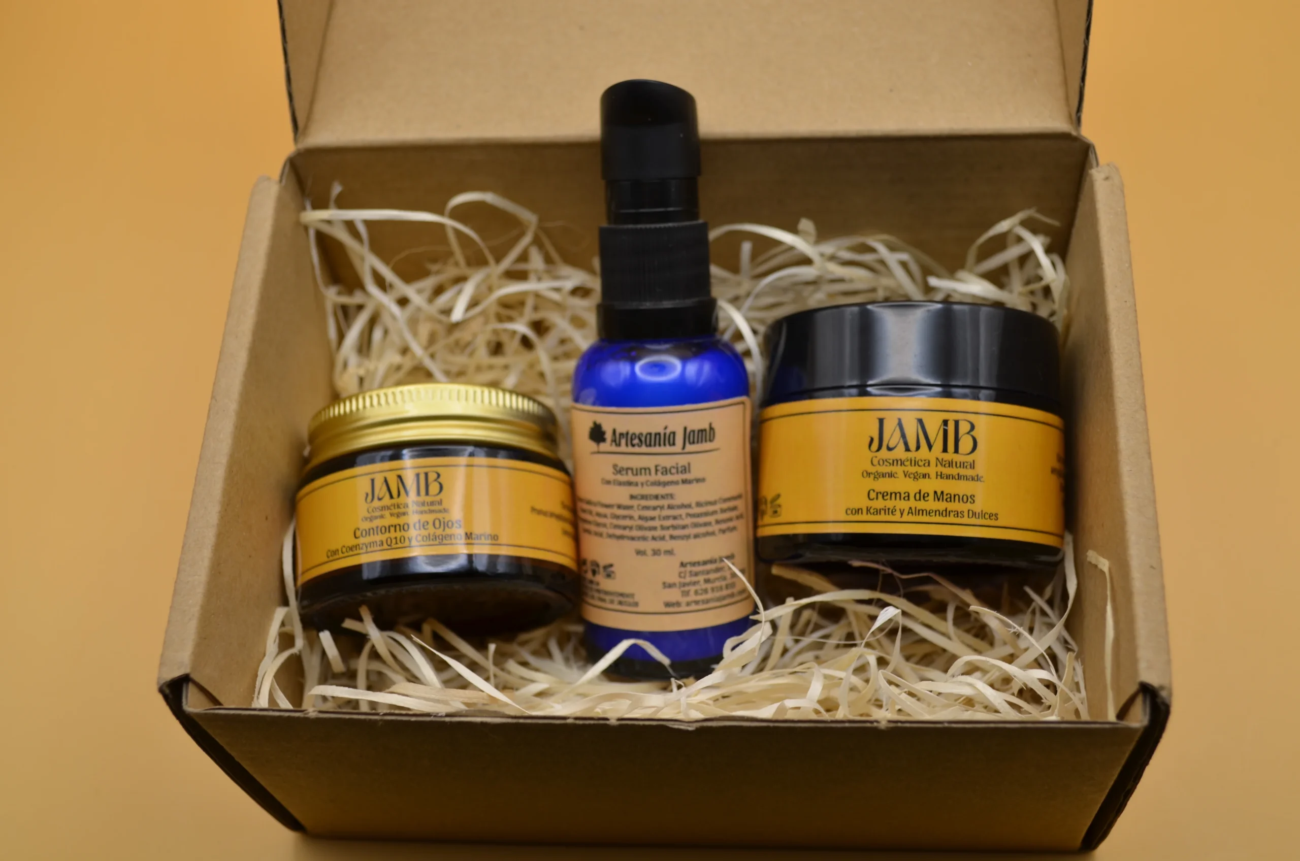 Este Kit Belleza está compuesto por 3 productos fundamentales de Artesanía Jamb: El Serum Facial con Elastina y Colágeno Marino; el Contorno de Ojos con Coenzyma Q10, Aceite de Argán y Colágeno Marino; y la Crema de Manos con Glicerina Vegetal, Karité y Aceite de Almendras Dulces.