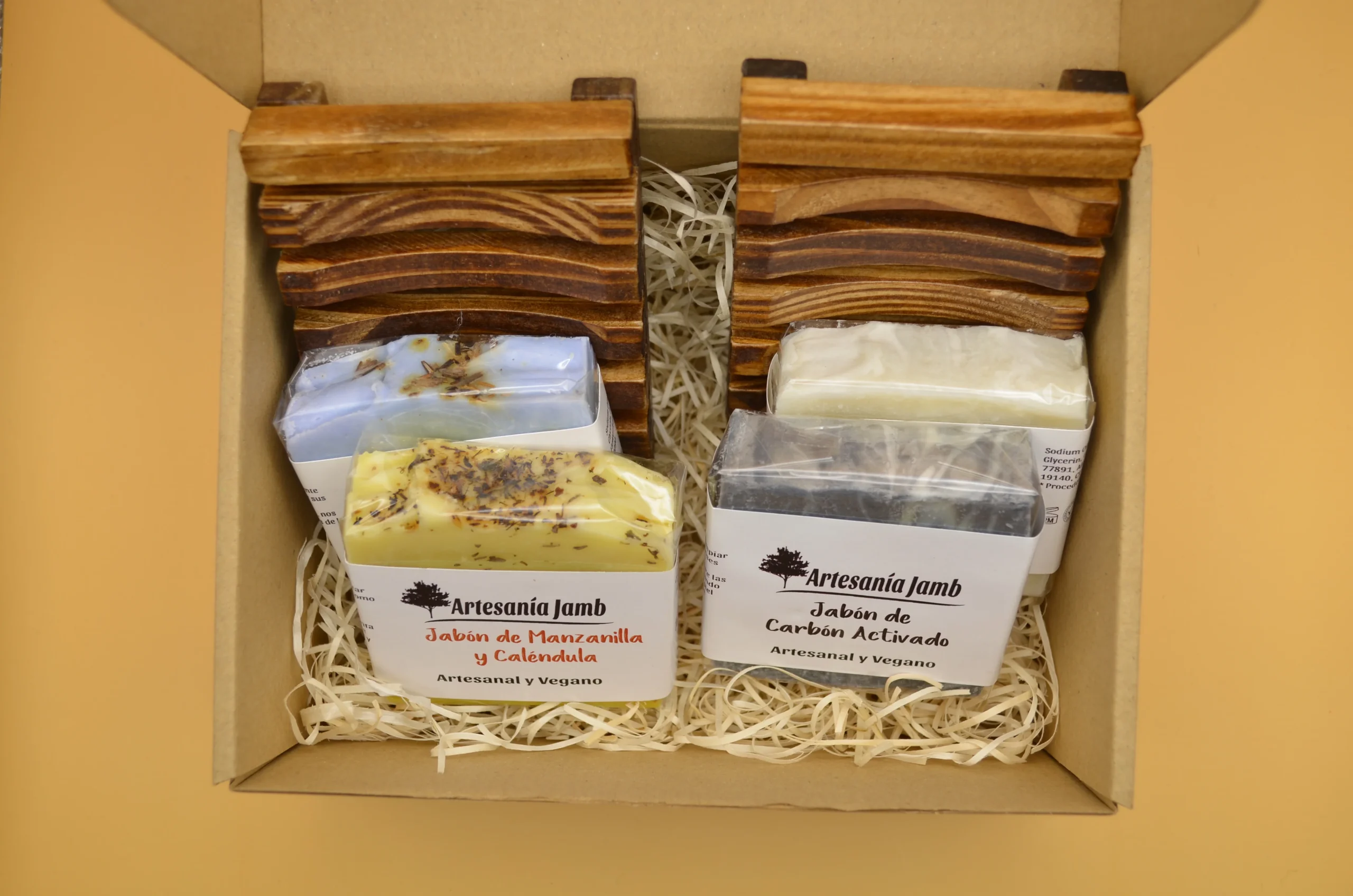 En este Kit Jabones especialmente diseñado para todos nuestros Soaps Lovers, hemos combinados 2 jabones para pieles mixtas: Lavanda y Carbón Activo. Y 2 jabones para Pieles Secas o Sensibles: Caléndula y Aloe Vera. Se trata de 4 jabones totalmente distintos tanto a nivel aromático como en las propiedades que aportan a nuestra piel. No obstante, todos ellos tienen una base hidratante de Aceite de Oliva y Coco que nos aporta una amplia cantidad de nutrientes y elementos reparadores. Además, el kit incluye 2 jaboneras de Bambú que harán más facial el uso de las pastillas de jabón y ampliarán su vida útil ya que nos generan un excelente drenaje y mantienen la barra de jabón siempre seca.